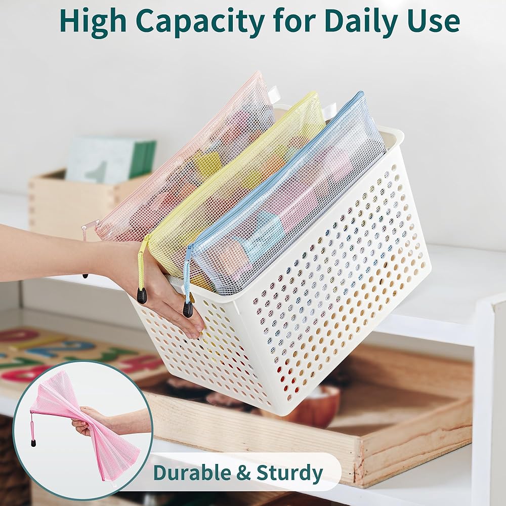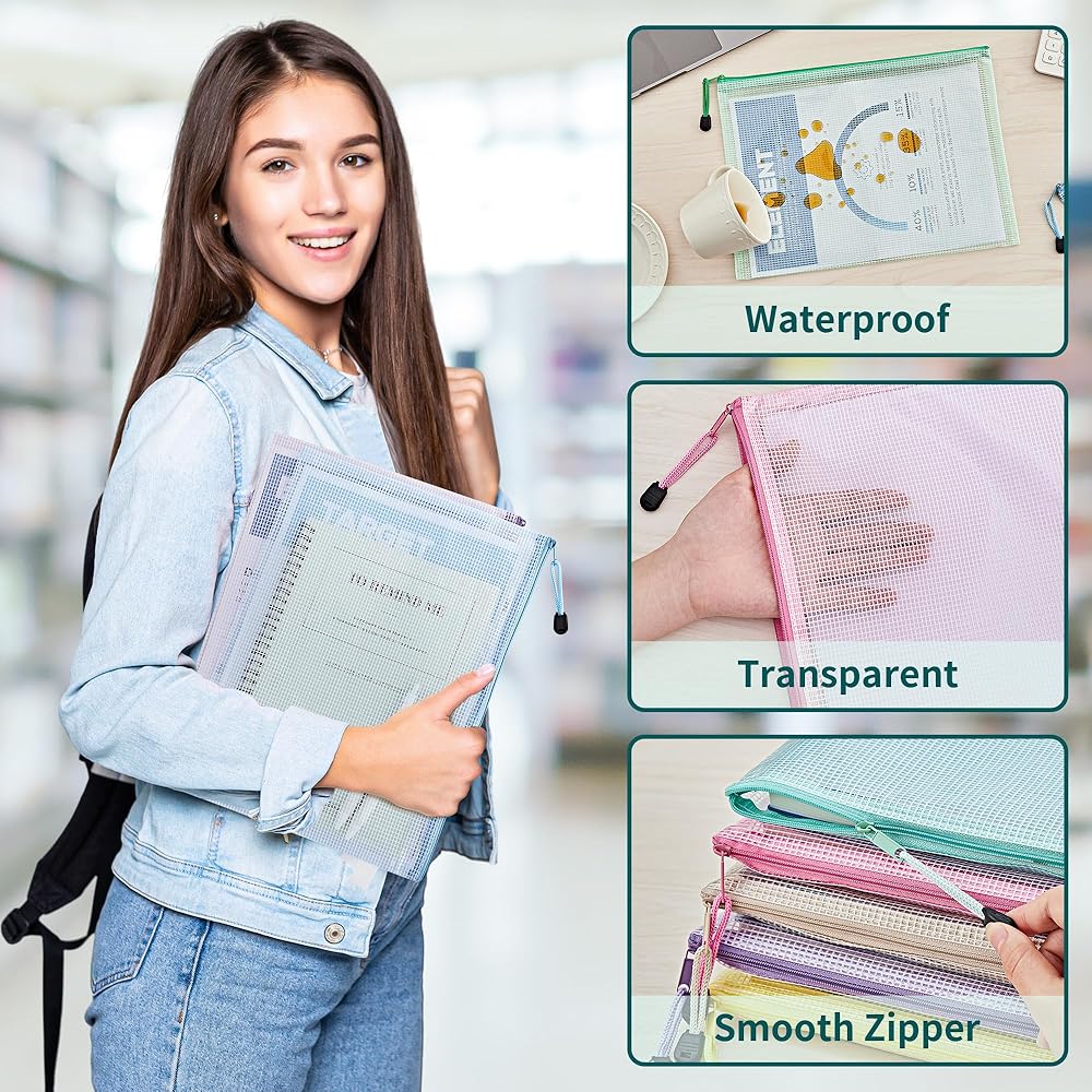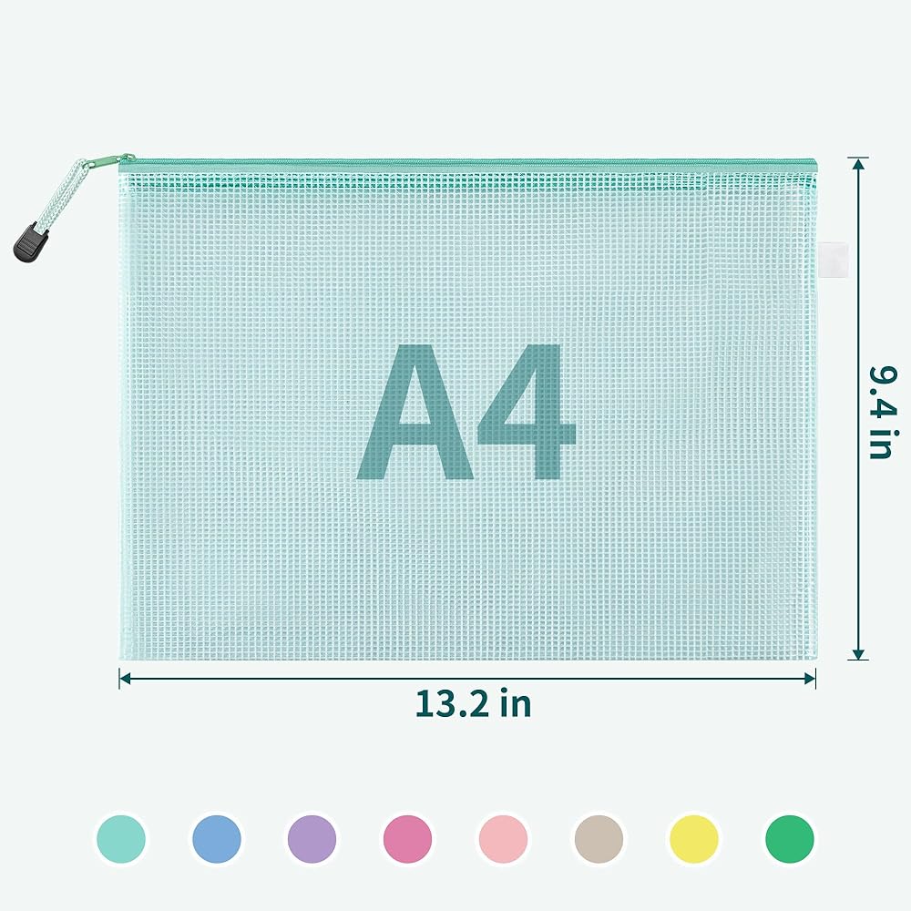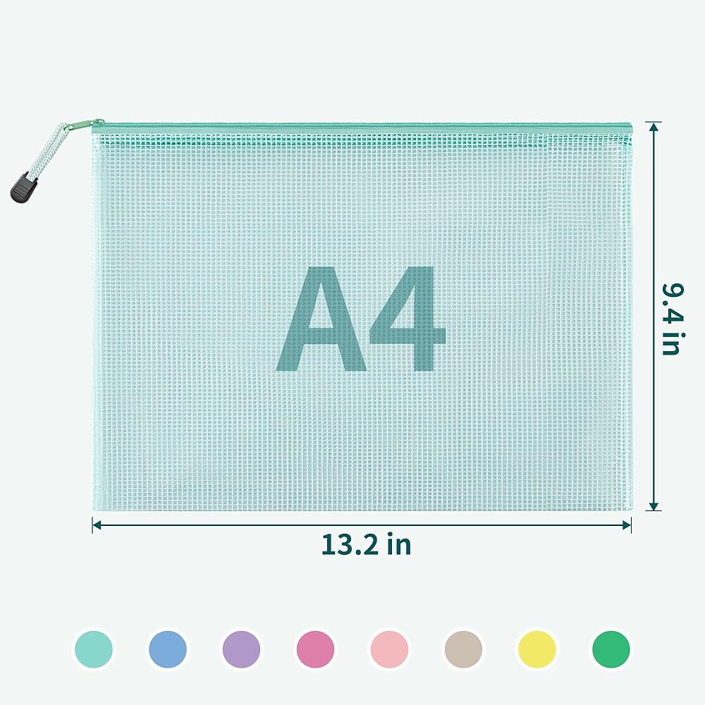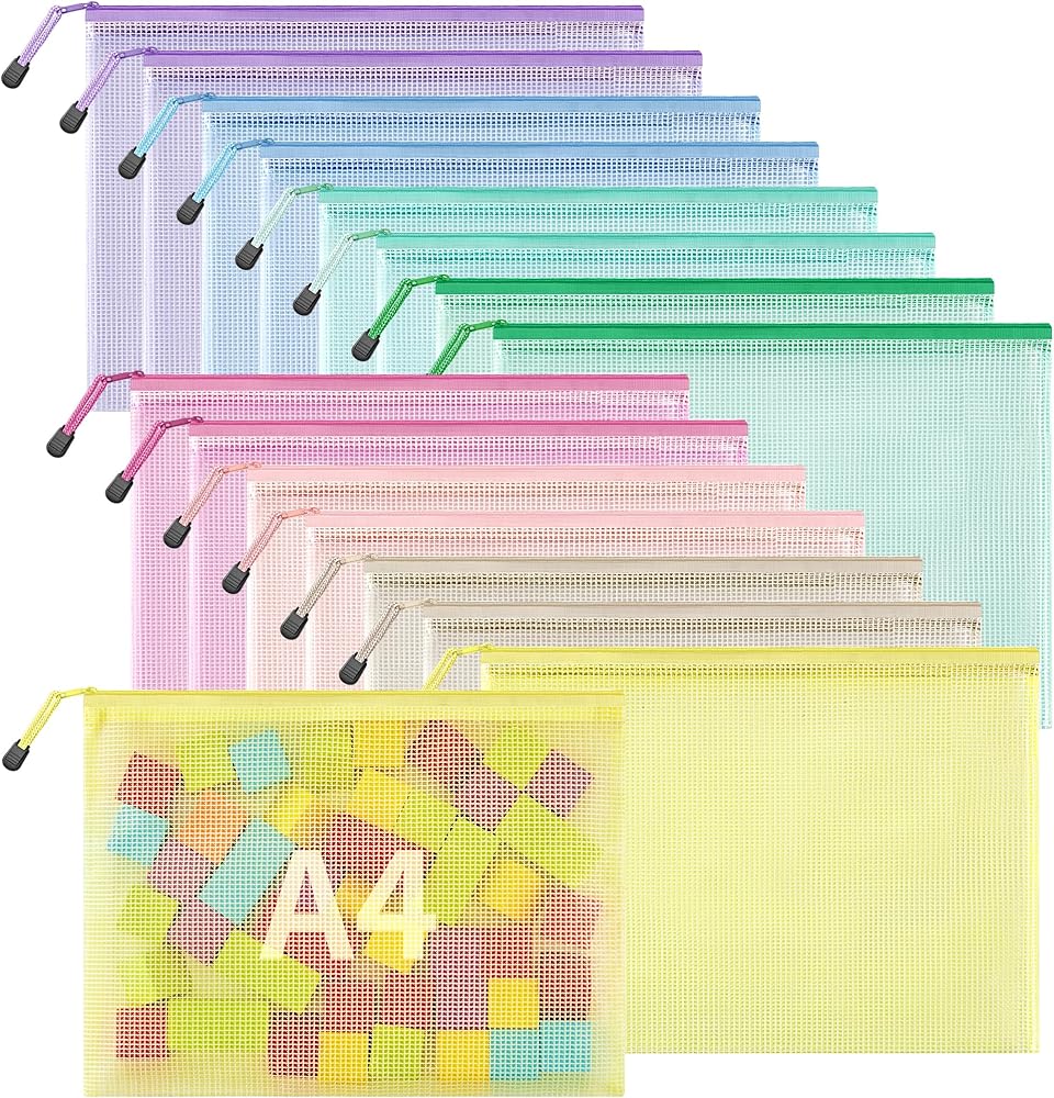 مجموعة حقائب شبكية بسحاب مكونة من 16 قطعة: تتضمن هذه المجموعة 16 قطعة من الحقائب الشبكية ذات السحاب مقاس A4/Letter (13.2 × 9.5 بوصة). تصميمها الشفاف والسحابات الملونة تجعل عملية تحديد المنتج أمرًا بسيطًا.