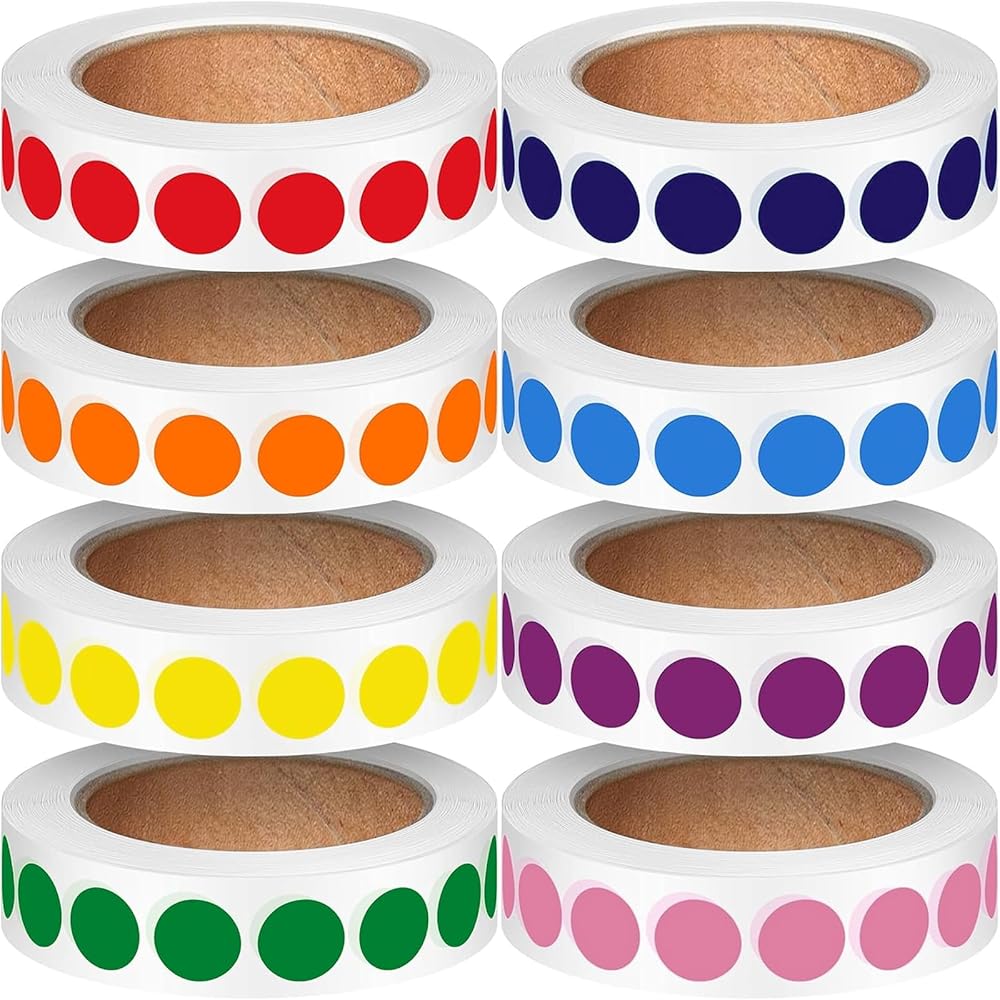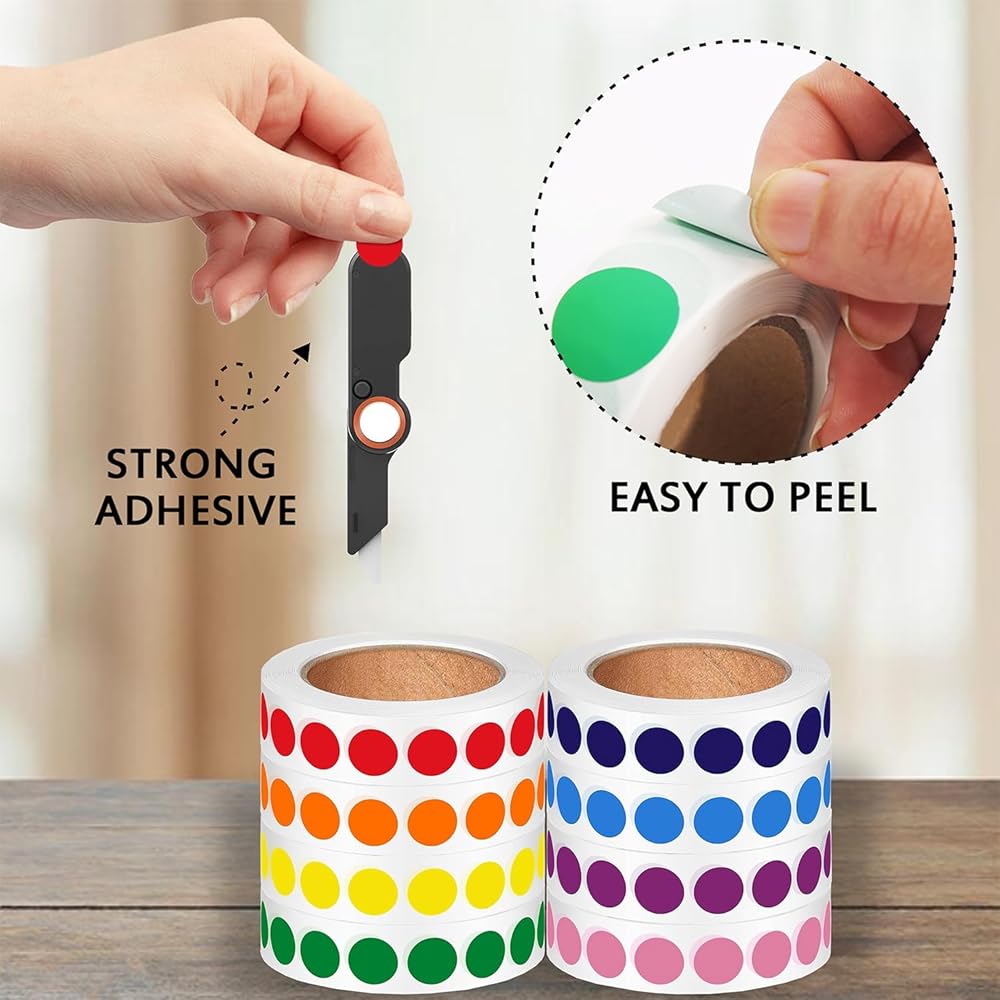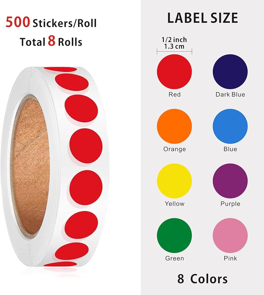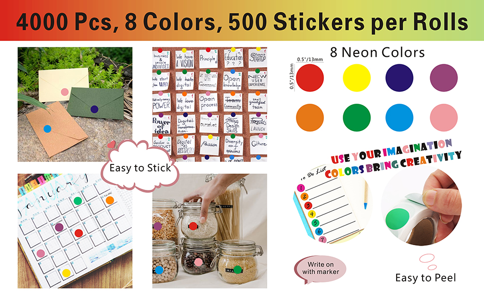 الكمية واللون: سوف تحصل على 4000 قطعة من الملصقات الدائرية بـ 8 ألوان مختلفة، بما في ذلك الأحمر والبرتقالي والأصفر والأخضر والأزرق الفاتح والأرجواني والأزرق والوردي و500 ملصق من كل لون.