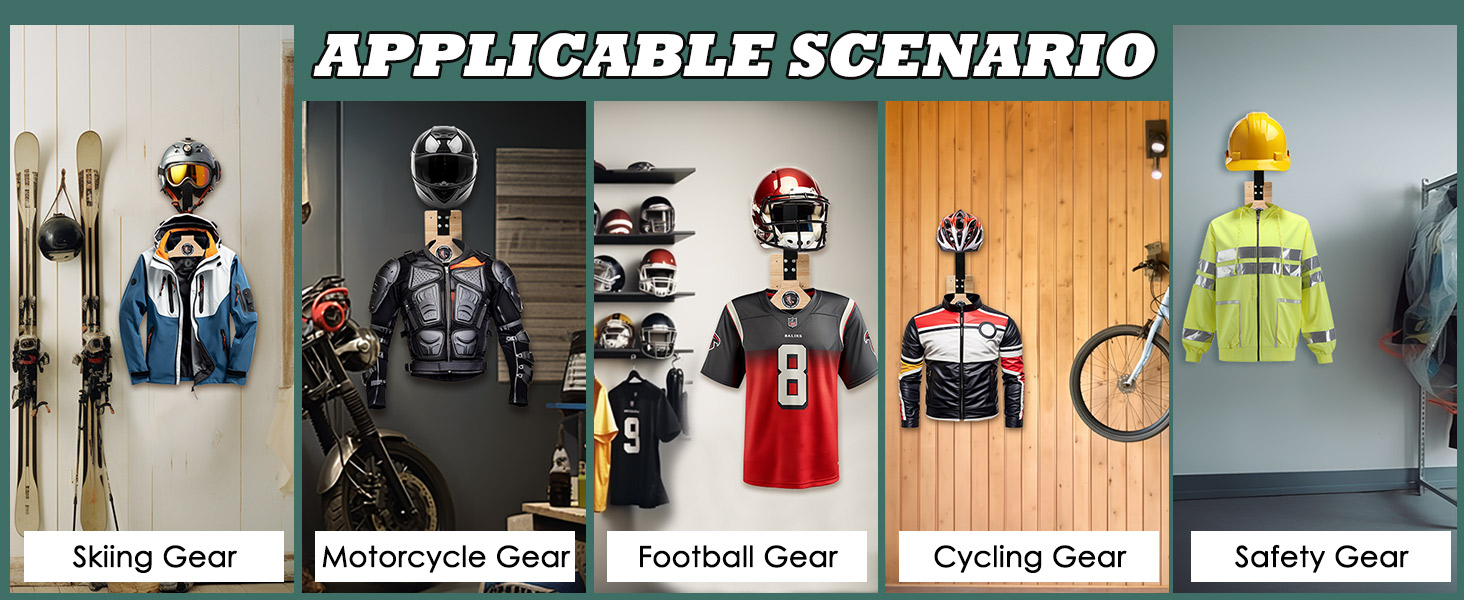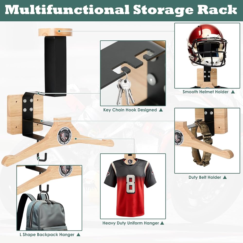 🏈【رف تخزين متعدد الوظائف】شماعة الخوذة مثالية لتخزين معداتك الرياضية. يمكنك تعليق خوذات مختلفة مثل خوذة الدراجة النارية، وخوذة البيسبول، وخوذة التزلج، وخوذة كرة القدم، والقبعات غير الرسمية. يأتي مع رف ملابس لتعليق ستراتك. يتضمن خطافًا قابلاً للفصل يوفر مكانًا لتعليق حقيبة ظهرك. بالإضافة إلى ذلك، يمكنك وضع المفتاح في الأخدود الموجود على جانب الرف الحديدي. إنه حل تخزين رائع لوضع الملابس والخوذ والقفازات والأحزمة والمفاتيح والحقائب وأي معدات أخرى.