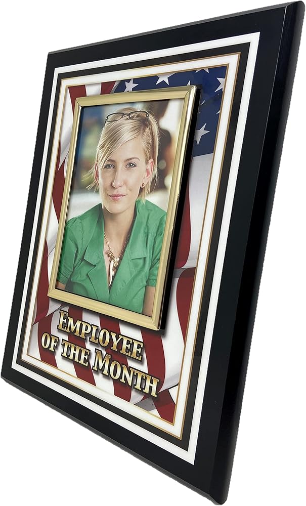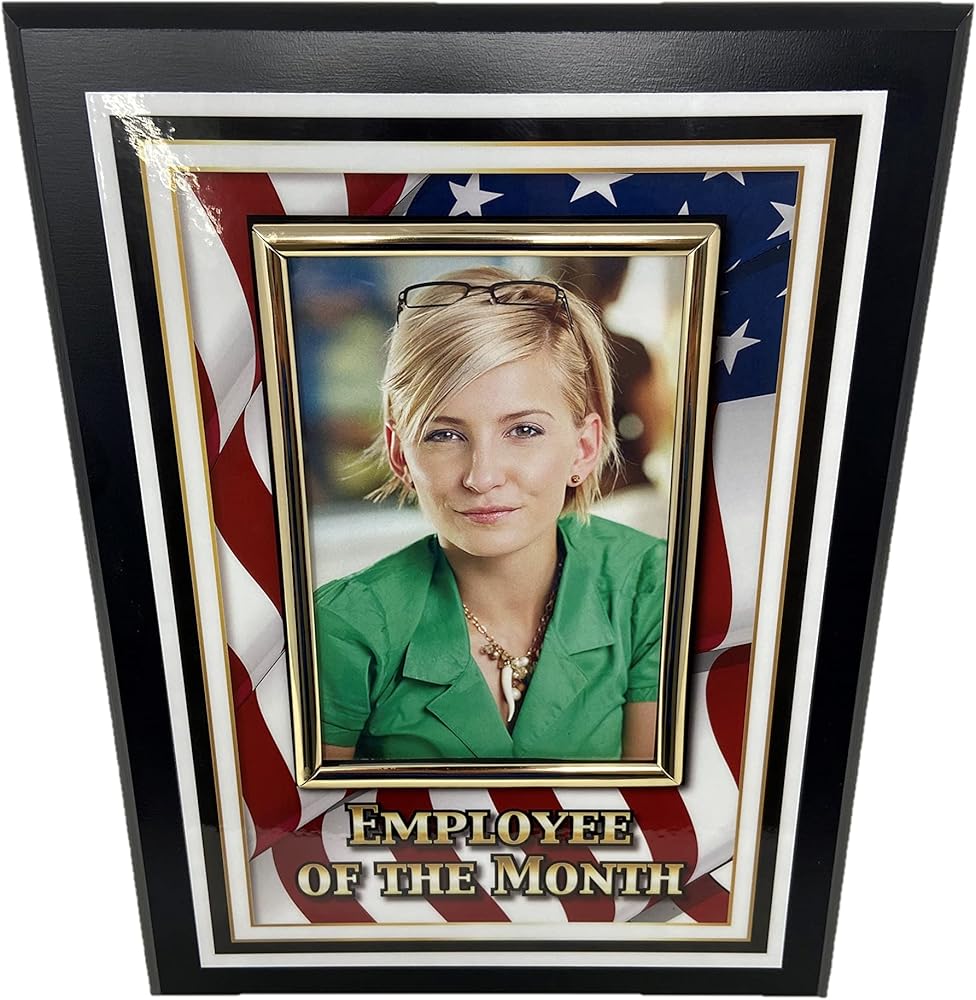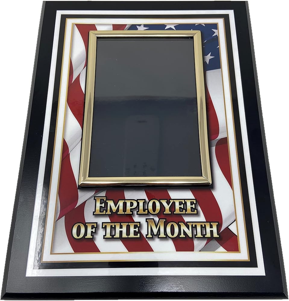 Employee of the Month Plaque. Show the appreciation that your employee deserves by displaying this plaque in your office or giving to the employee to take home. This custom designed employee award comes on an 9"x12" plaque with a laminated base as shown in the photos. The gold frame and plate are used in this employee award. This employee appreciation award is excellent to use on a monthly basis to build a wall of your valued employees of the month!! With U.S.A. logo