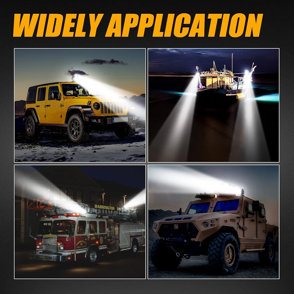【تطبيق واسع 】 ضوء البحث مناسب لتطبيقات تيار مستمر 10-30 فولت. يمكن استخدامه على نطاق واسع في سيارتك أو قاربك أو شاحنتك أو مركبة الطرق الوعرة. يمكن استخدامه أيضًا للإضاءة المنزلية والخارجية والطوارئ، إلخ.