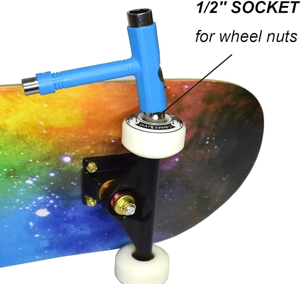【Innovative Structure】The T skateboard tool includes 3 different of size sockets: 1/2” for wheels, 3/8” for hardware, 9/16” for trucks, a slide-out Phillips head wrench screwdriver fits into the top of the tool, when not in use.