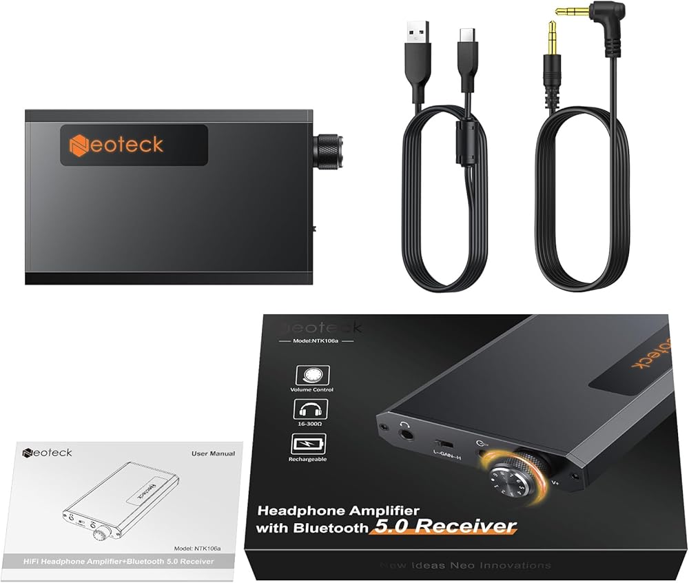 مضخم سماعة الرأس المحمول Neoteck مقاس 3.5 مم مع جهاز استقبال Bluetooth 5.0، ومفتاح كسب على مرحلتين، ومضخم سماعة HiFi 16-300 أوم، وسطح من الألومنيوم غير اللامع