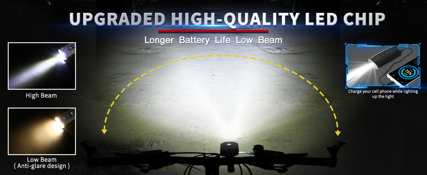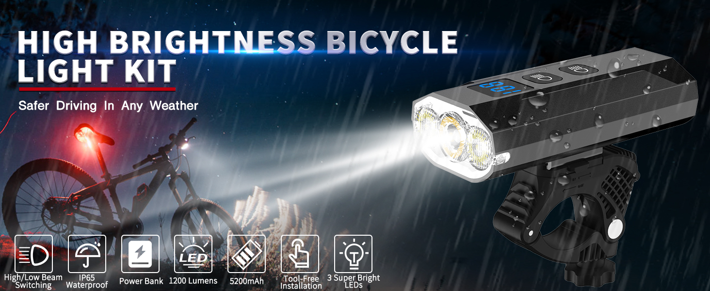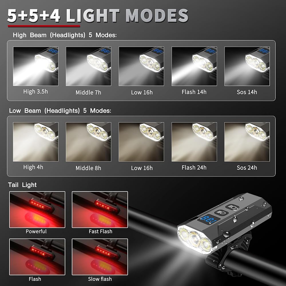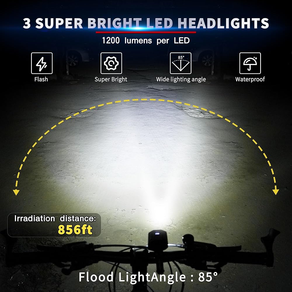 تضيء في أي مكان: تتميز مصابيح الدراجة للركوب الليلي بـ 3 مصابيح LED قابلة للتعديل تصل إلى 856 قدمًا. يوفر ضوء الدراجة الساطع هذا خيارات شعاع عالية ومنخفضة. المطر أو أشعة الشمس، المصباح الأمامي LED الساطع للدراجة، المجهز بمقاومة الماء IP65، يضمن رحلة آمنة في جميع الظروف الجوية.