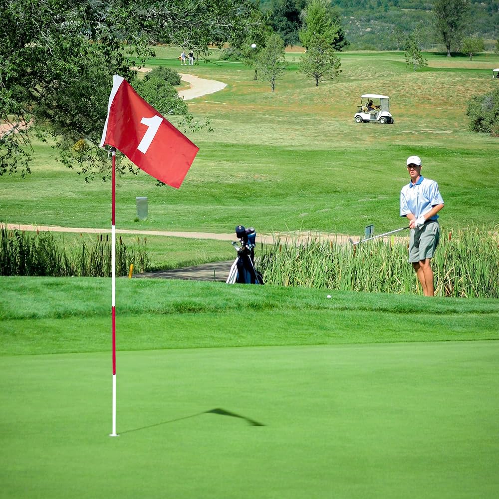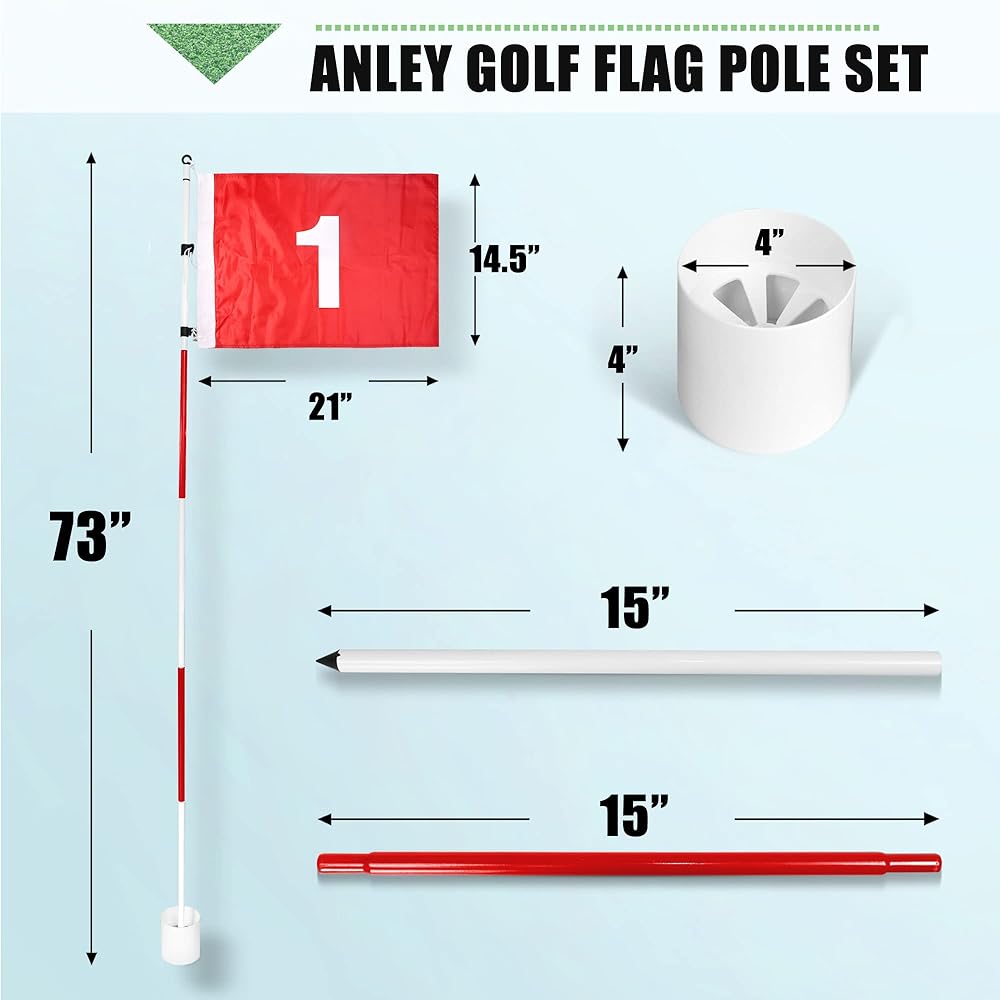 The Anley golf flagstick kit contains a 5-section set flagstick (6 Ft height), 1 red flag (14.5x20") and 1 standard H4"*D4" hole cup.