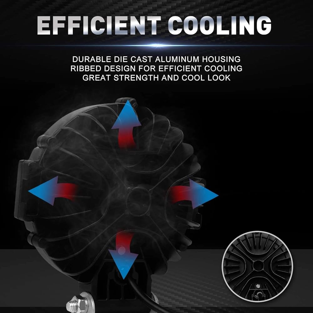 【تبديد ممتاز للحرارة】 يستخدم شريط الإضاءة LED الدائري للطرق الوعرة سبائك الألومنيوم 6063 لضمان تبديد أفضل للحرارة وأفضل قدرة على إغلاق حوض الحرارة. مروحة الألومنيوم ذات التصميم الحاد تجعلها تبديد الحرارة بشكل أسرع وأكثر فعالية. مع فتحة تنفس مطورة لإطلاق الرطوبة. تمديد عمر أكثر من 50,000 ساعة.