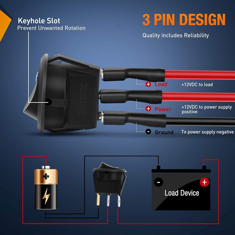 • Perfect Design: Designed to connect and disconnect a DC12V 20A electrical circuit at will, SPST: ON-OFF control; 2 pole design (On/Off), 3rd poles with LED to be connected to earth. Fluorescent lamps will be lighted up when the switch is turned on