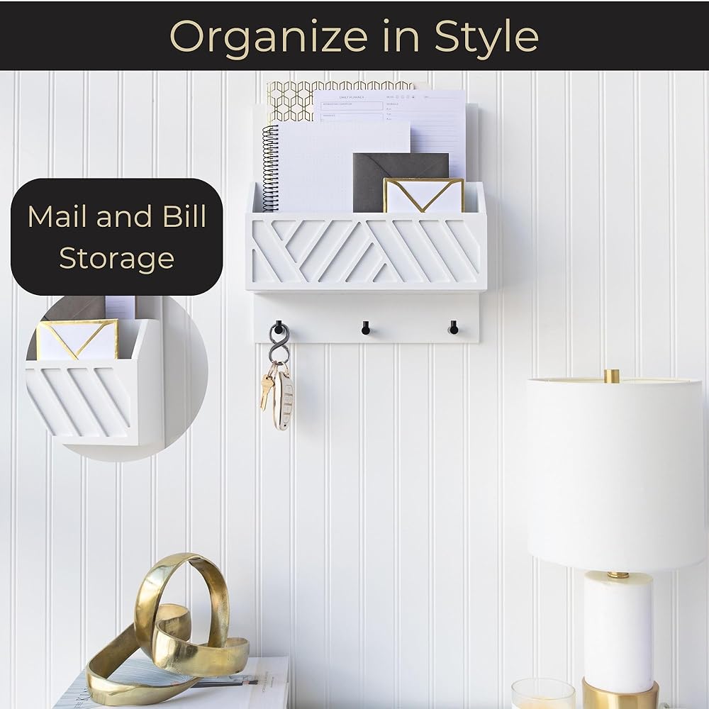 Transform your space into a clutter-free haven with our wall-mounted mail organizer, featuring deep pockets, a patented geometric design, and modern black key hooks. Say goodbye to messy countertops and hello to stylish organization. Keep your entryway organized and clutter-free with our Mail Organizer Wall Mounted. This versatile command center features a white wooden design with ample space for all your mail and keys. With convenient key hooks and a mail shelf, this wall-mounted organizer is perfect for any home. Say goodbye to lost keys and messy mail with our stylish and functional mail and key organizer.