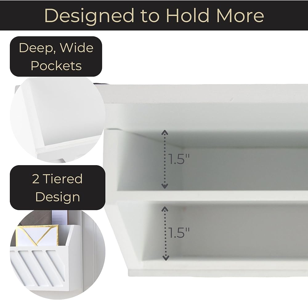 Featuring deep and wide pockets, this organizer is designed to accommodate letter-size file folders. The mail holder with key hooks two-tiered design provides added storage capacity while maximizing space efficiency, making it ideal for small spaces.