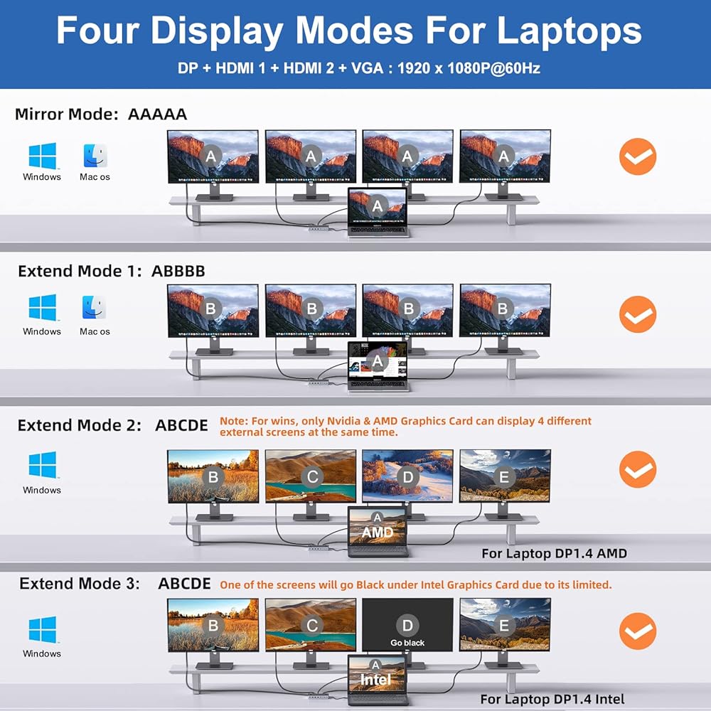 مخرج فيديو 4K وشاشة ثلاثية - دقة منفذي HDMI تصل إلى 3840x2160@30 هرتز ومنفذ VGA يصل إلى 1920x1080@60 هرتز، متوافق مع دقة مختلفة. يمكن أن تصل الدقة إلى 4K/60 هرتز (DP1.4) عند توصيل شاشة HDMI واحدة. بالنسبة لنظام التشغيل Windows، يدعم القاعدة العرض الثلاثي في حالة توصيل 3 شاشات (ليس لنظام التشغيل Mac OS). نظام التشغيل Mac نفسه لا يدعم وضع MST، ولكن قاعدة الإرساء الخاصة بنا يمكنها توفير محتوى مختلفين لجهاز Macbook والشاشات