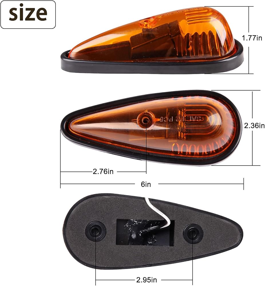 يتكون كل مصباح علامة على سقف الكابينة على شكل دمعة من 9 قطع من مصابيح LED الكهرمانية ويوفر رؤية ليلية أفضل لسيارتك على الطريق. تكون مصابيح علامة الدمعة المضمنة بمصابيح LED أكثر سطوعًا وأسرع، وتسحب تيارًا أقل وتولد حرارة أقل من المصابيح المتوهجة؛ قم بتحويل المصابيح المتوهجة القديمة إلى مصابيح LED أكثر حداثة؛