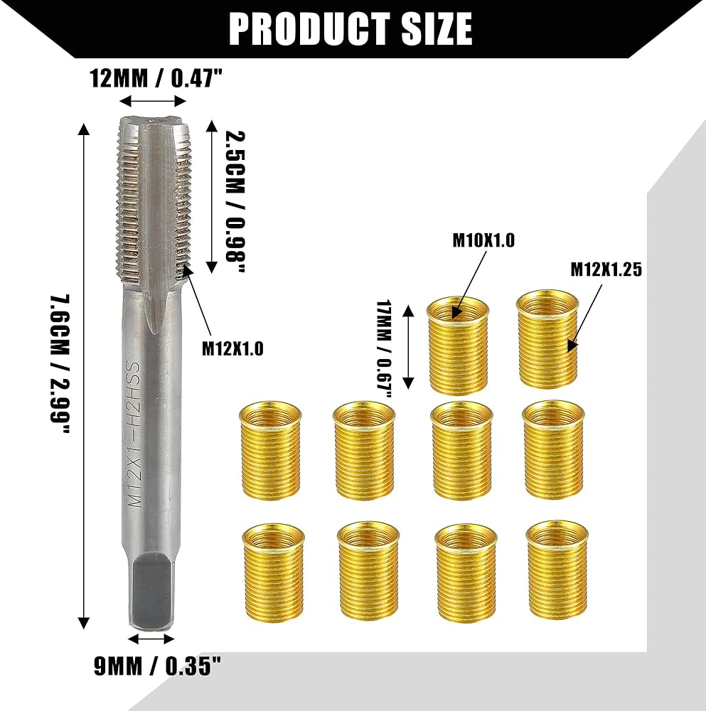 دليل التثبيت:1. قم بمطابقة طقم إصلاح الخيط المقصود؛ 2. تحقق من الحجم على الصنبور والإدراج؛ 3. قم بحفر التجويف أو الخيط التالف للخيط الذي تنوي استعادته؛ 4. تنظيف الحفرة بقطعة قماش للتنظيف. 5. قم بتشغيل الصنبور قليلاً في الفتحة، من حافة القطع المدببة السفلية، إلى العمق الصحيح يدويًا أو على أداة آلية بحجم 1/4 بوصة مربعة؛ 6. نظف الخيط؛ 7. تحقق من حجم الإدخالات، ثم قم بربط ملحق الإصلاح الملولب باستخدام أداة الإدراج.