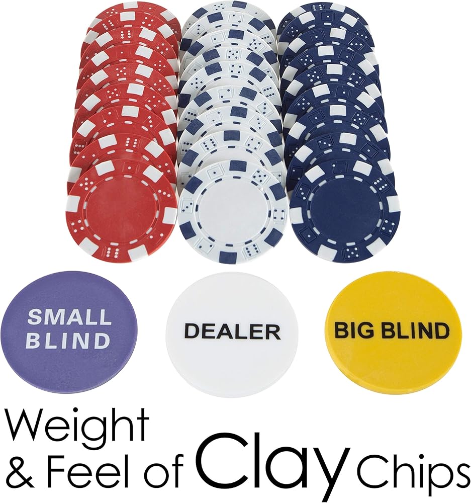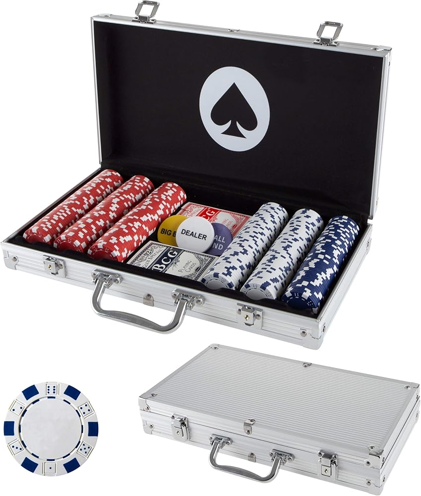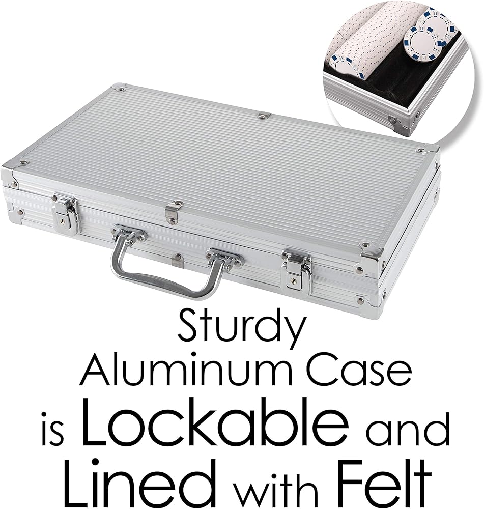 The chips' dice-striped design adds some casino style to your poker games. Players will also appreciate the chips' clever detailing, with alternating die faces and stripes around the edges. And thanks to the heavy-duty yet lightweight aluminum case, you can easily keep your chips protected and organized. The case includes a securely riveted handle that holds up to long-term use and a sleek black velour interior with space for 300 chips, two decks of cards, a dealer button, and two blind buttons. The chips--which come in red (150), white (100), and blue (50)--measure 39mm in diameter each and weigh 11.5 grams.