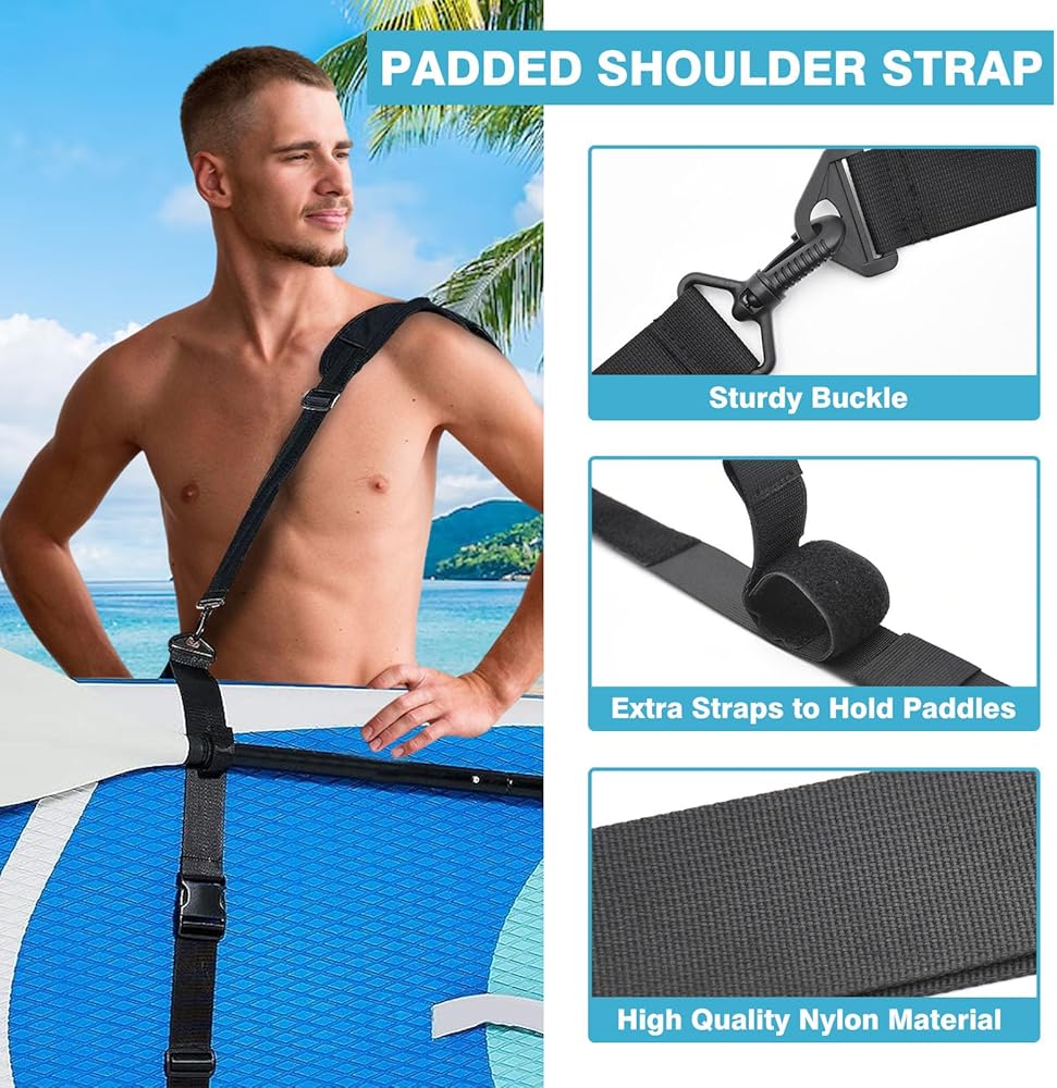 【راحة بدون استخدام اليدين】 استمتع بتجربة الراحة القصوى مع حزام حمل قوارب الكاياك الفريد الذي يسمح لك بحمل لوحتك بشكل مريح على كتفك، وتحرير يديك للأنشطة الأخرى. والأفضل من ذلك، أن الحزام يحمل مجدافك بشكل آمن، مما يوفر تجربة حقيقية بدون استخدام اليدين أثناء التحرك من وإلى منطقة الإطلاق.