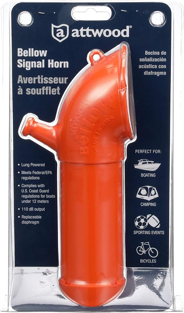 This Attwood Bellow Signal Horn uses lung power to produce a signal that can assist in personal protection and safety on land and on the water. This horn uses your breath, not CO2, Freon, or batteries. It meets USCG Rule 33 (Annex III), and EPA regulations. This durable red plastic horn is 8 inches H x 3 ½ inches W. It has a molded-in loop to which a lanyard can be attached. Attwood Corporation has been an award-winning leader in engineering, testing, and manufacturing the highest quality marine products for over 100 years. We deliver safe and reliable lighting, fuel systems, water systems, seating & pedestals, swim ladders, custom upholstery, and general marine accessories that are easy to install and meet regulatory compliance.