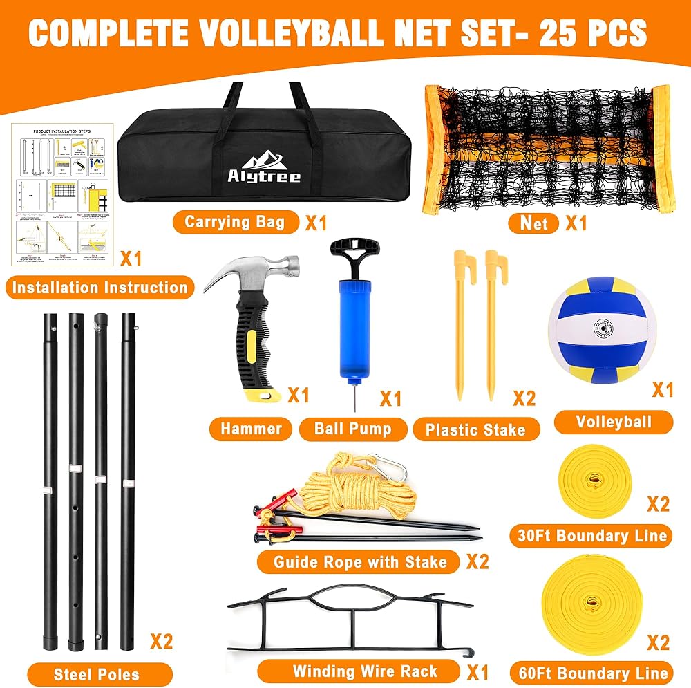 مجموعة الكرة الطائرة الكاملة: 1 × شبكة كرة طائرة بحجم عائلي، 8 × أعمدة فولاذية، 1 × كرة طائرة ناعمة، 1 × مضخة كرة بإبرة، 2 × حبال توجيه مع أوتاد، 2 × خط حدود 30 قدمًا، 2 × خط حدود 60 قدمًا، 1 × حامل سلكي متعرج 4 × أوتاد بلاستيكية لتثبيت الخط الحدودي، 1x مطرقة، 1x دليل التركيب، 1x حقيبة تخزين قماش أكسفورد. إجمالي 25 قطعة، تلبي احتياجاتك لقضاء يوم ممتع مع عائلتك أو أصدقائك.