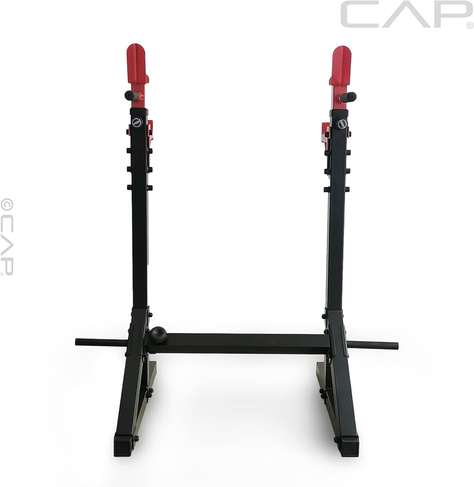 Step up your strength training routine with the CAP Barbel Adjustable Squat Rack, which allows you to target the thigh, hamstring and lower back muscle groups, along with the chest and triceps with the use of its dip handles. This robust adjustable rack is built with heavy-duty steel construction, 2-inch tubing, and a powder-finish to prevent rust, making it a great addition to any home gym. Use just the rack to target the lower body, or add a weight bench (sold separately) to use the rack for bench pressing. Featuring dip station handles, two plate-posts (storage for weight plates). The safety catches add an element of safety when performing squats or lunges. With a weight capacity of 300-pounds, this squat rack is built to withstand heavy loads.