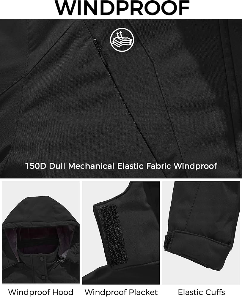 سترة تزلج مقاومة للرياح - تصميم السحاب الأمامي الكامل مع غطاء مقاوم للرياح يمنع دوران الهواء بشكل فعال ويمنع الرياح من التسرب عبر السحاب.