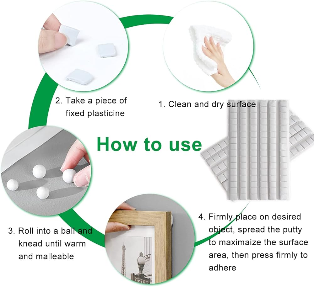 [Easy to use and Remove]How to use---Take a small piece of putty and knead it on the palm of your hand to make it soft and viscous, and then place it on the back of the object and press it firmly on a clean, dry surface. How to remove--Simply roll it off the surface.