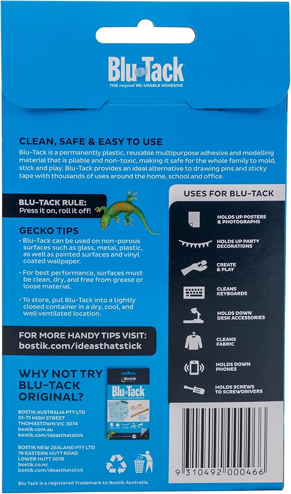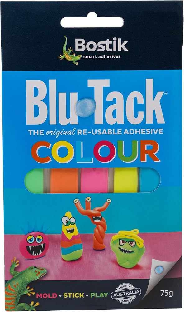 Bostik Blu-Tack Reusable Adhesive: 75g [orange, green, pink, blue & yellow - 5 strips/pack] / Assorted Orange, Green, Pink, Blue & Yellow - Bostik Blu-Tack is the is the original reusable adhesive. It is permanently plastic and pliable (it can be readily formed into any shape) and each pack comes with strips for ease of use. In the blue-only pack there are 4 strips each approximately 3/4 inch wide x 8 inches long and in the color pack there are 5 strips each approximately 1/2 inch wide x 8 inches long. A few applications for the putty include using to stick posters, sealing around windows and doors, cleaning dust and hair from clothing, keeping pictures straight and modeling. Use Blue-Tack on non-porous surfaces, painted surfaces, vinyl coated wall paper, glass, metal, etc. Remember to press it on, but roll it off. Any remaining Blu-Tack material can be removed by rolling or dabbing with another blob of Blue Tack. Uses & Applications Leave note on door. Create 3 dimensional models. Hold candles in place in holders. Remove dust from awkward places. Pick up dropped screws or nails. Attach screw to screwdriver to get to hard places. Hold figurines in place on the window sill. Use to reduce noise vibration. Hold markers in place on white board. Clean computer keys. Hold speakers in place on speaker stands. Graphite artists can use as a graphite eraser or magnet. Keep picture frames from shifting around on wall. Hold end of measuring tape on wall when measuring long runs.