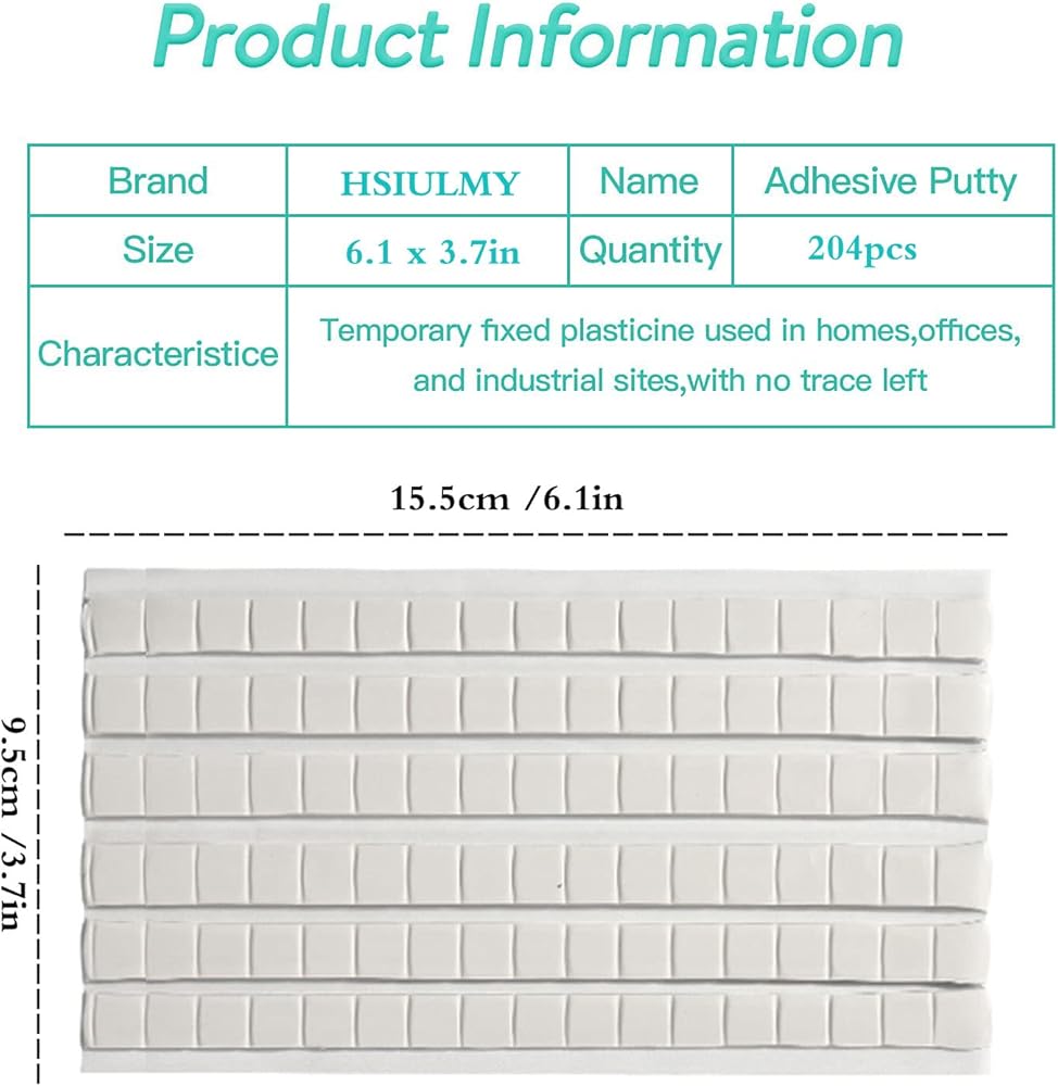 محتوى العبوة: سوف تحصل على عبوة واحدة/ ورقتين من المعجون اللاصق، و102 قطعة لكل ورقة وإجمالي 204 قطعة متضمنة. كل كتلة تقريبًا 1 سم/0.4 بوصة × 1 سم/0.4 بوصة × 0.3 سم/0.1 بوصة.