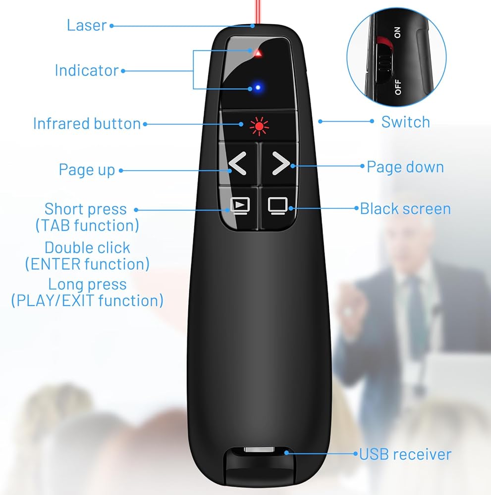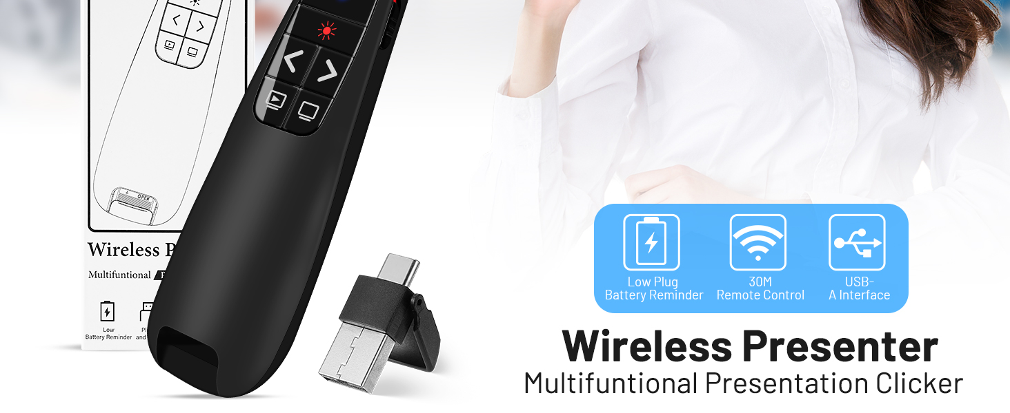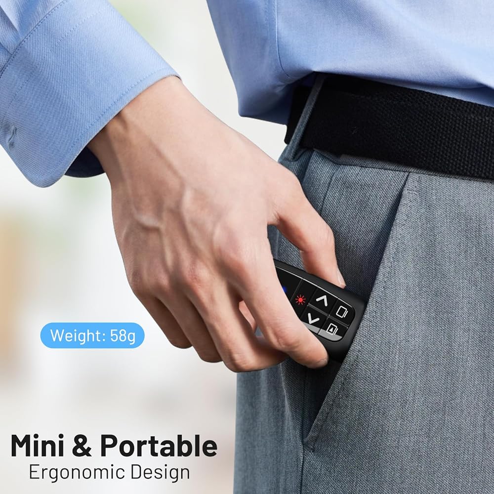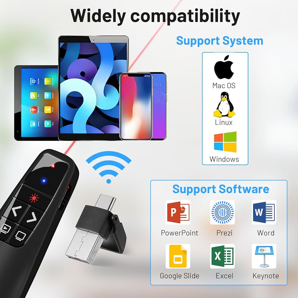 • إعداد سهل الاستخدام: ما عليك سوى توصيل جهاز الاستقبال بسرعة 2.4 جيجا هرتز بمنفذ USB بجهاز الكمبيوتر الخاص بك، وستكون جاهزًا لبدء العرض التقديمي الخاص بك. لا يلزم تثبيت البرامج أو الإعداد المعقد. مناسبة لجميع الأعمار ومستويات المهارة.