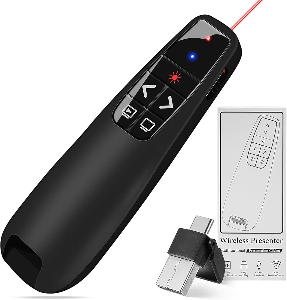 • تسليط الضوء على النقاط الرئيسية: الضوء الأحمر الساطع لهذا العرض اللاسلكي مرئي للغاية على أي خلفية، مما يجعله مثاليًا للتأكيد على الجوانب المهمة في العرض التقديمي الخاص بك. تأكد من أن جمهورك لا يفوت التفاصيل المهمة.