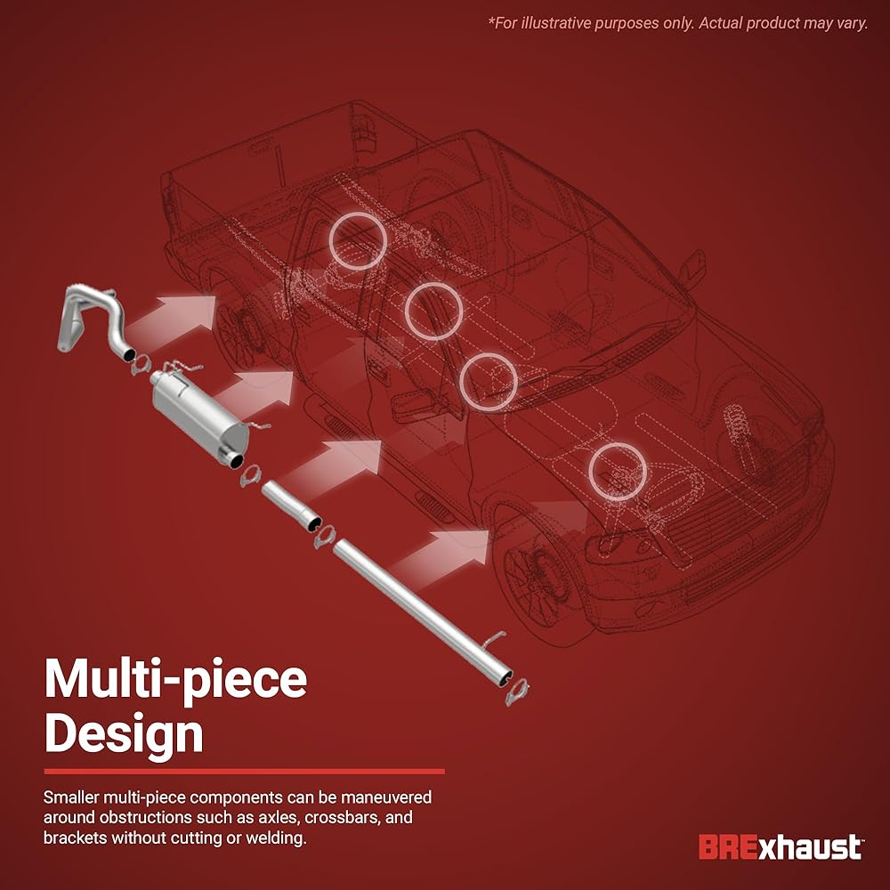 تصميم مرن متعدد القطع - تصميم متعدد القطع مثبت بمسامير وقابل للتعديل يتيح تركيبًا فائقًا من خلال السماح بتثبيت نظام العادم البديل حول العوائق مثل المحاور والقضبان المتقاطعة والأقواس.