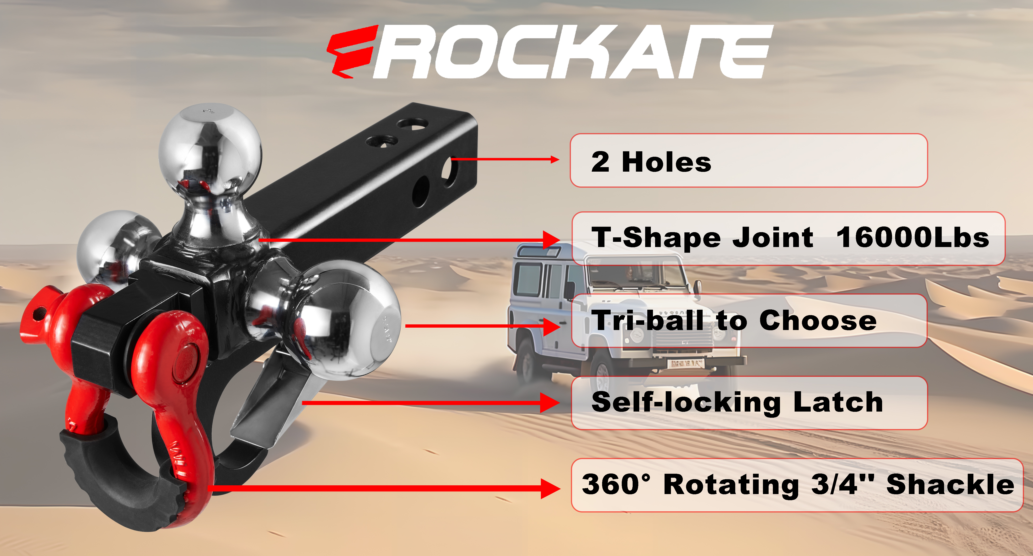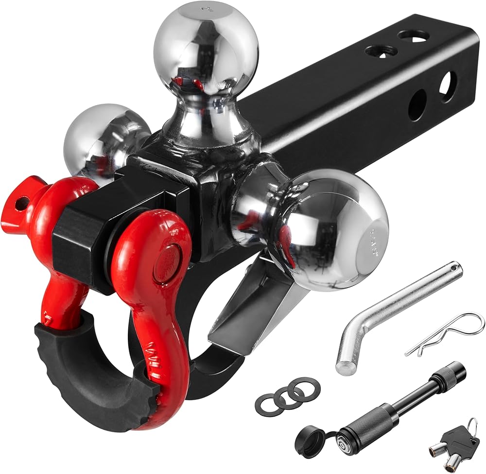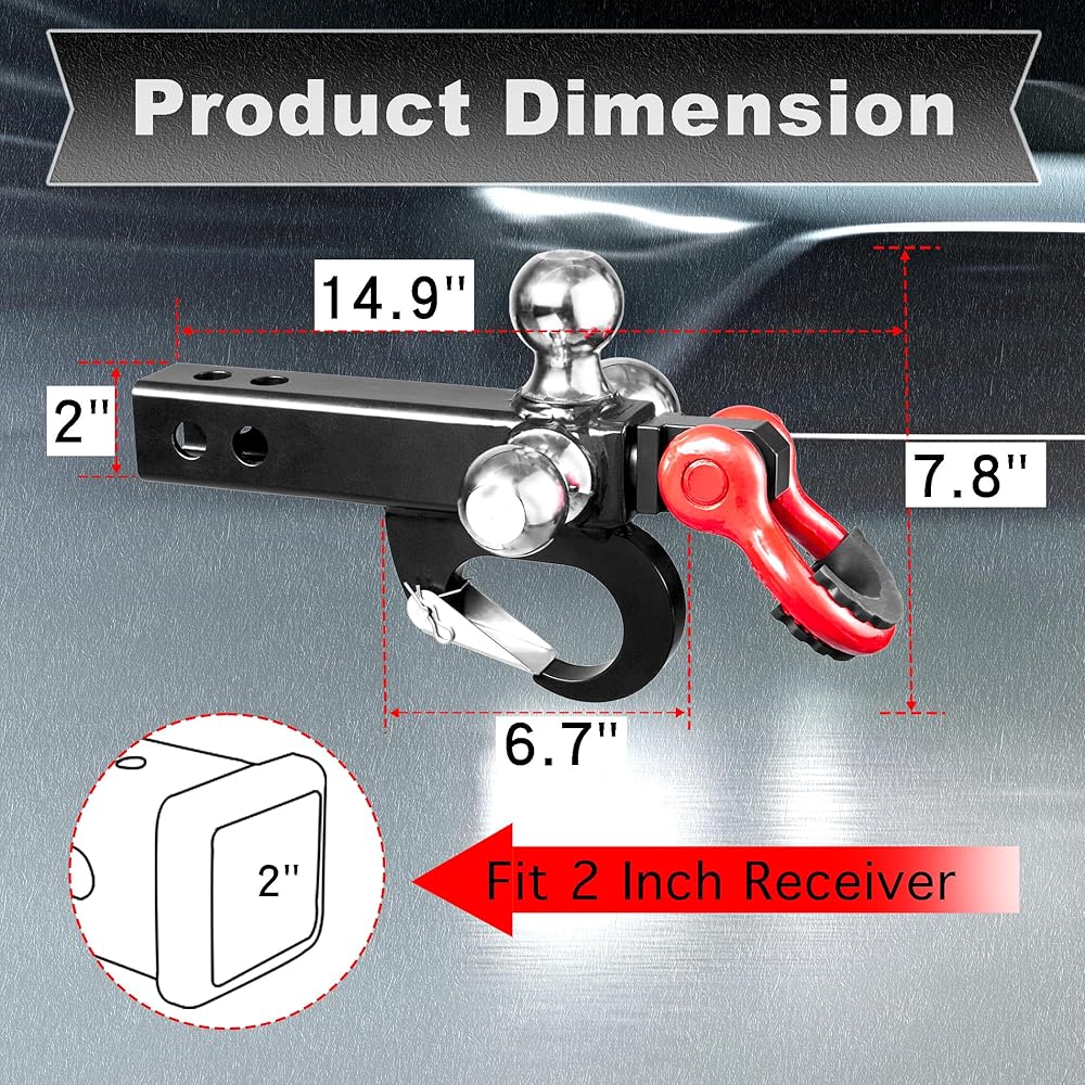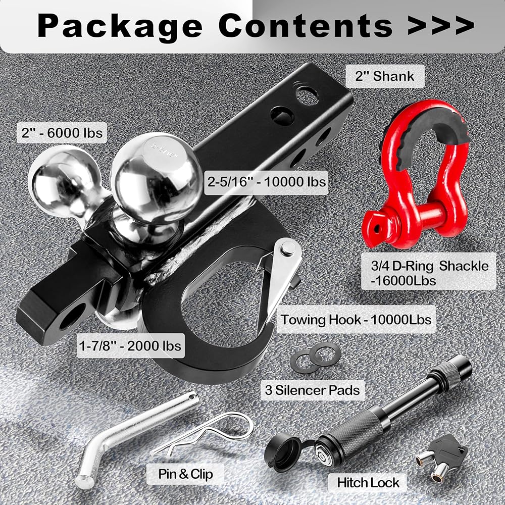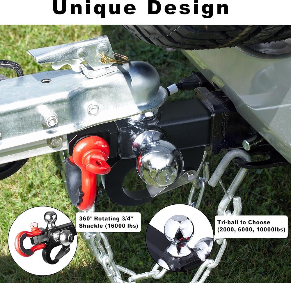 سعة متعددة: حجم الكرة الثلاثية يأتي مع 1-7/8 بوصة، 2 بوصة، 2-5/16 بوصة و3/4 بوصة مع 4 سعة مختلفة للاختيار: 1-7/8 بوصة - 2000 رطل. - 6000 رطل. 2-5/16 بوصة - 10000 رطل. تكبل 3/4 بوصة - 16000 رطل كحد أقصى. مناسبة لتطبيقات السحب الثقيلة.
