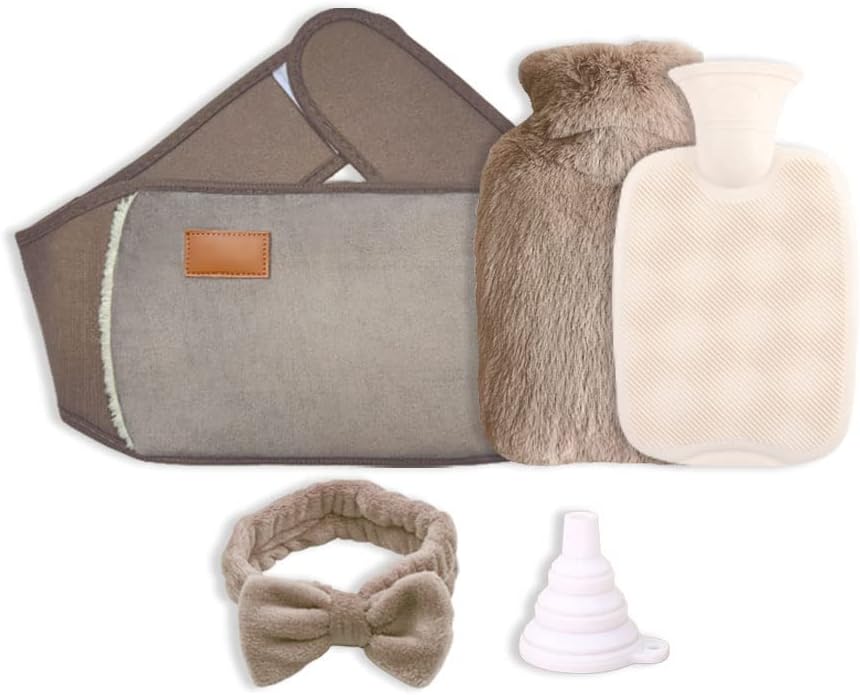 حقيبة زجاجة ماء ساخن 3 في 1 من Anlising، حقيبة ماء دافئ، حقيبة زجاجة ساخنة، زجاجة ماء ساخن مع غطاء للخصر، حقيبة زجاجة ماء ساخن مع حزام ناعم + عصابة رأس + قمع، لتخفيف آلام الخصر والرقبة الخلفية (بني)