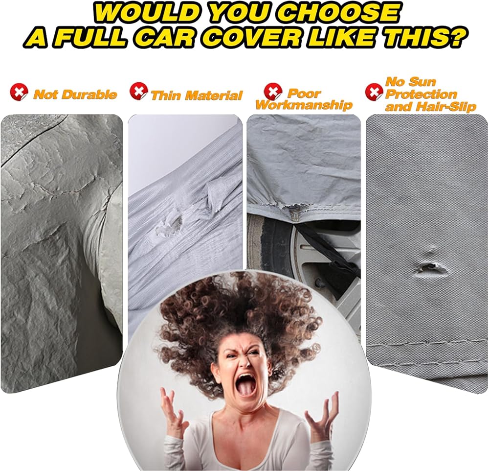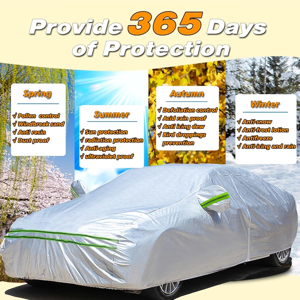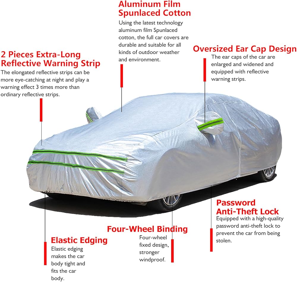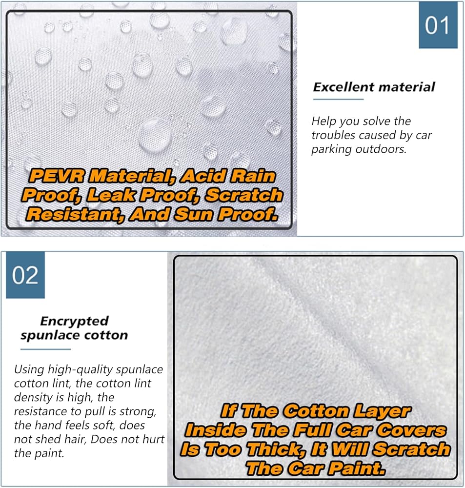 【مادة عالية الجودة】- غطاء السيارة بالكامل KEYOOG مصنوع من طبقة خارجية من مادة بيفا ومادة بطانة قطنية عالية الجودة، وهي أخف وزنًا ومتينة مرتين مثل المنتجات المماثلة الأخرى، وهي أكثر متانة. ❶ مقاومة للماء بنسبة 100%، وغير منفذة، ومناسبة جدًا للمطر والثلج والأمطار الحمضية. ❷ قطن داخلي مغزول عالي الكثافة، أكثر نعومة، لا يوجد رمل، ولا يسبب ضررًا لطلاء السيارة.