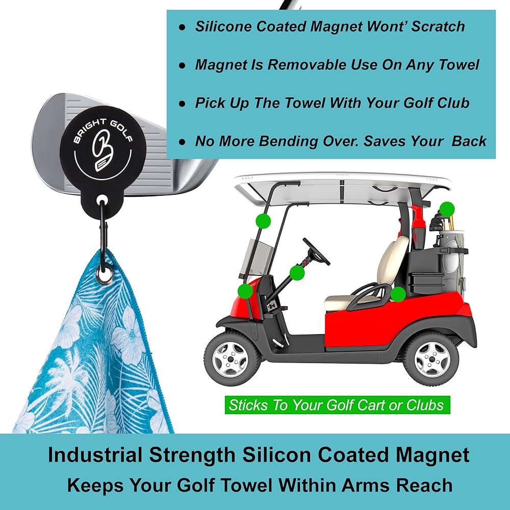 The super strong magnet on our golf towel makes it easy to stick the towel on your golf cart, golf bag or golf clubs. The magnet allows you to pick up your golf towel from the green without bending over, saving your back. Just touch your golf club to the magnet and you're ready to go to the next shot.