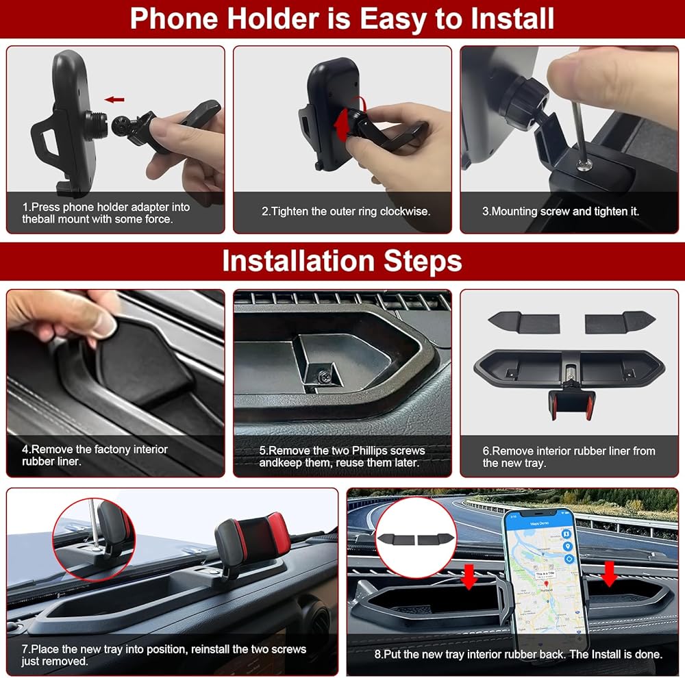 【مريح ومريح للسائقين】 يتميز حامل هاتف Dash Phone لصندوق تخزين ملحقات Jeep Wrangler بمزايا واضحة في توفير حامل ثابت للهاتف المحمول، ومساحة تخزين إضافية لإكسسوارات Jeep Gladiator، وملحقات الجيب ومنفذ شحن الهاتف المحمول المحجوز. لا تعمل ملحقات جيب رانجلر JL على تحسين سلامة القيادة فحسب، بل توفر أيضًا وظائف مريحة وعملية.