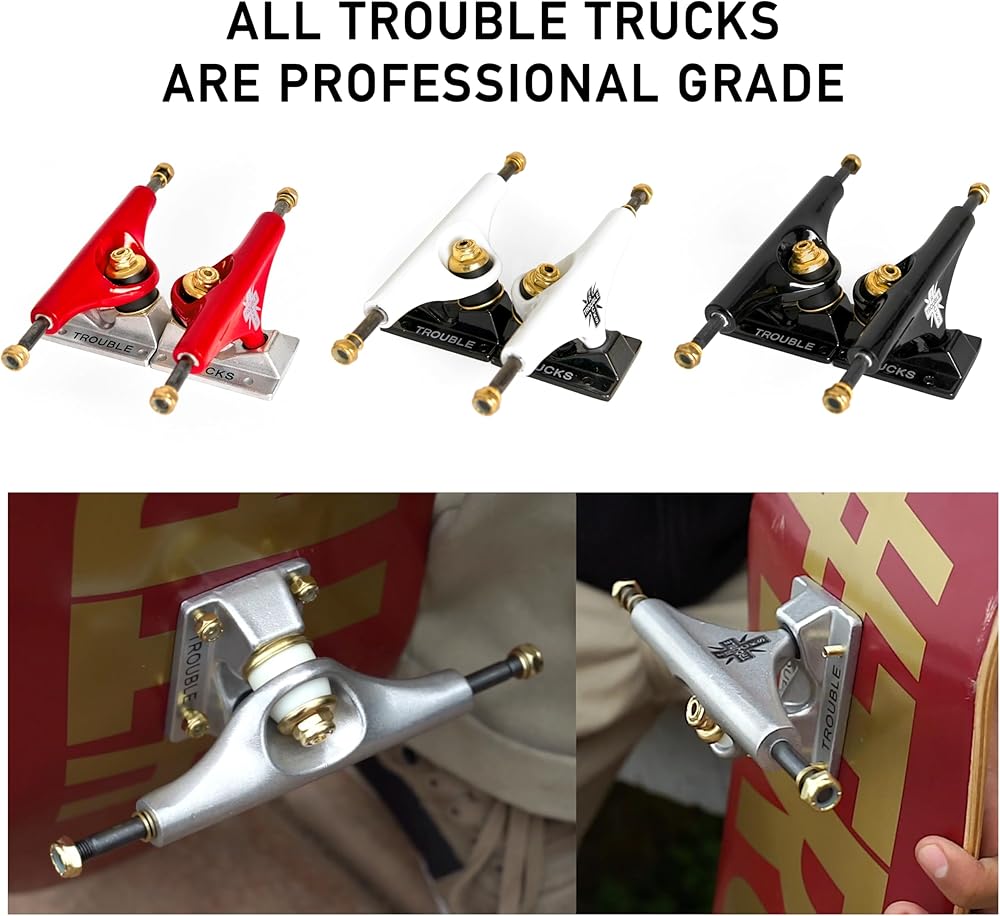 - تعد شركة Trouble Skateboards شركة مصنعة وموزعة للشاحنات عالية الأداء وشريط الإمساك والأسطح والملحقات منذ عام 1996.