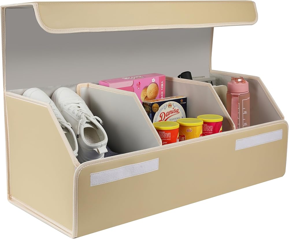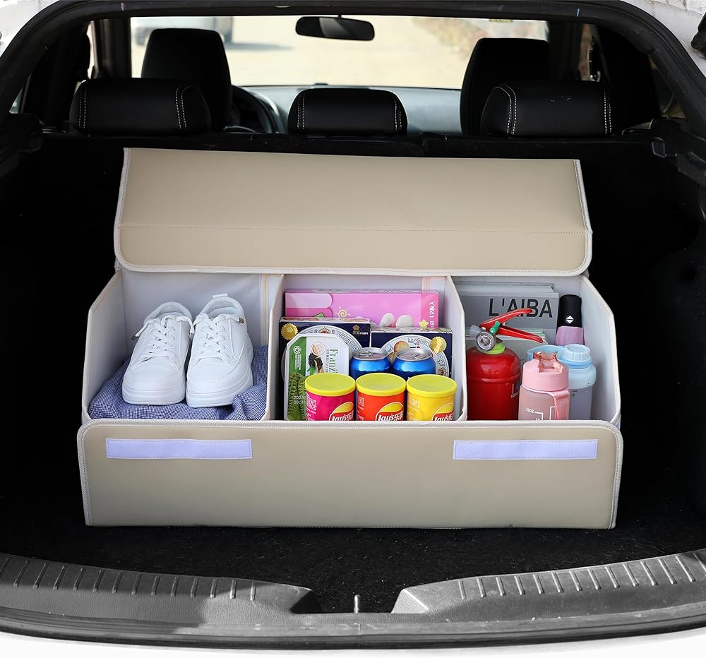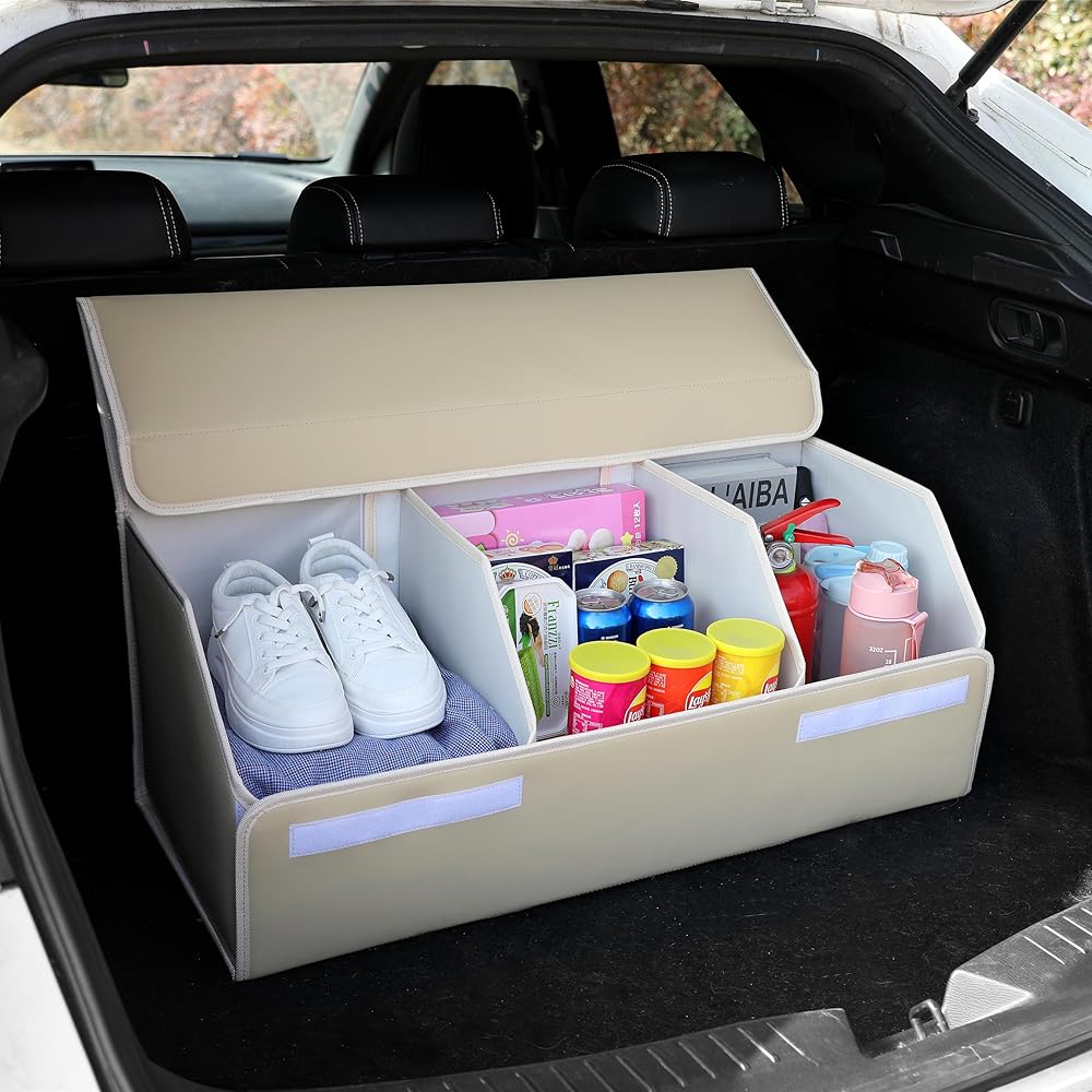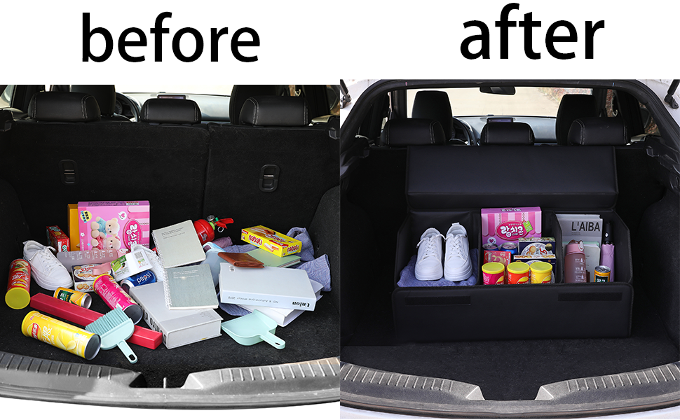 الميزات: منظم صندوق السيارة والتخزين يجعل تنظيم السيارة سهلاً وبسيطًا. تنظيم مجموعة متنوعة من المنتجات، يحتوي صندوق التخزين على مساحات متعددة للبقالة والأدوات واللوازم المكتبية والإكسسوارات أو الألعاب والمزيد