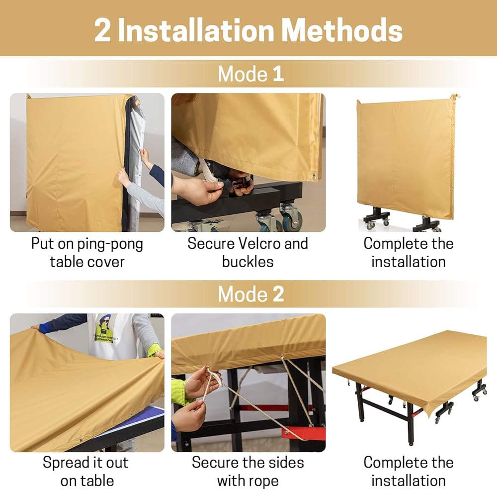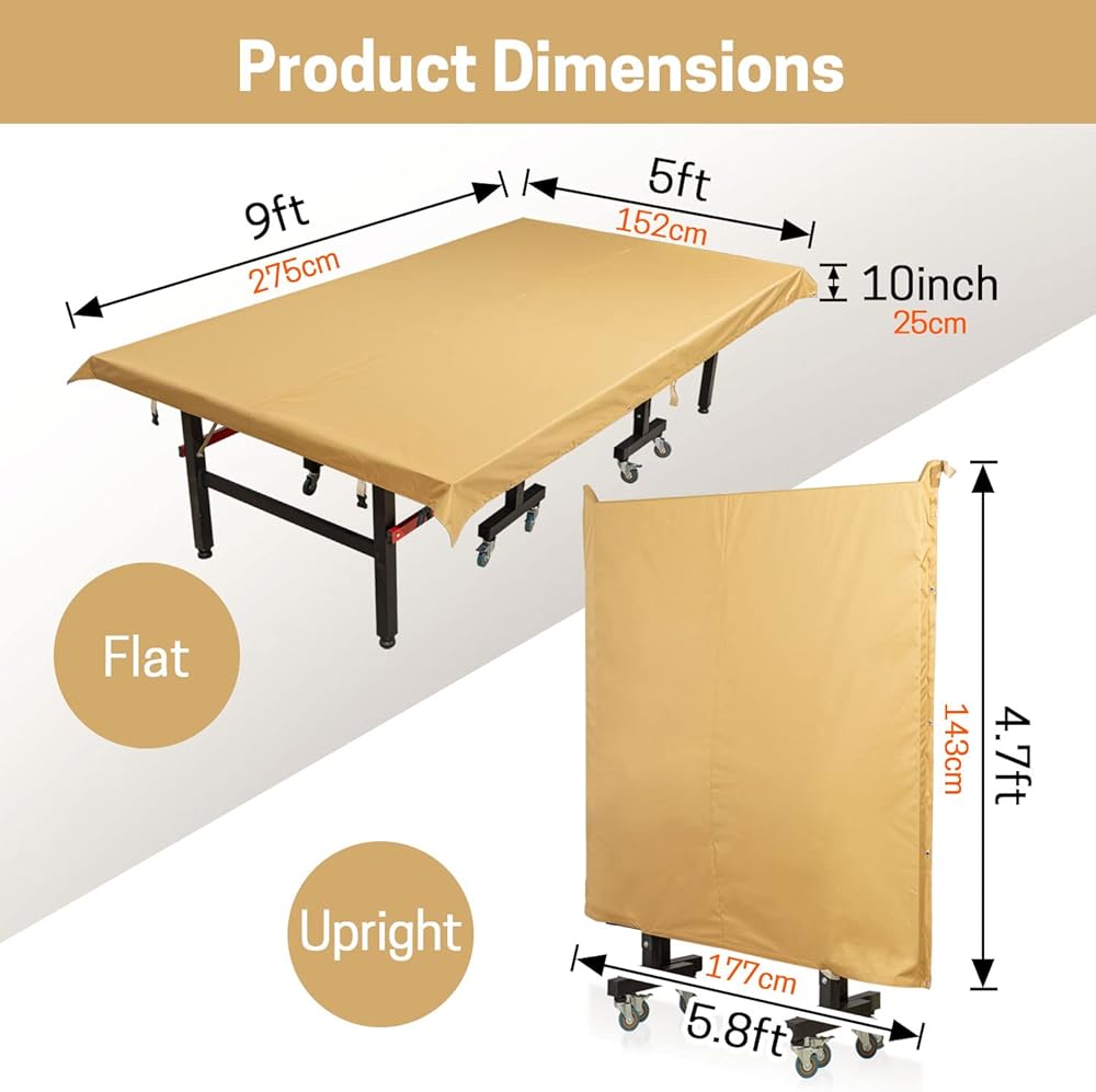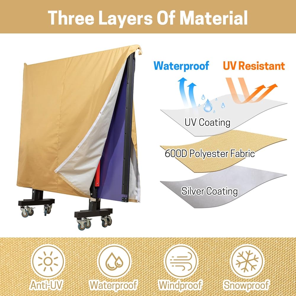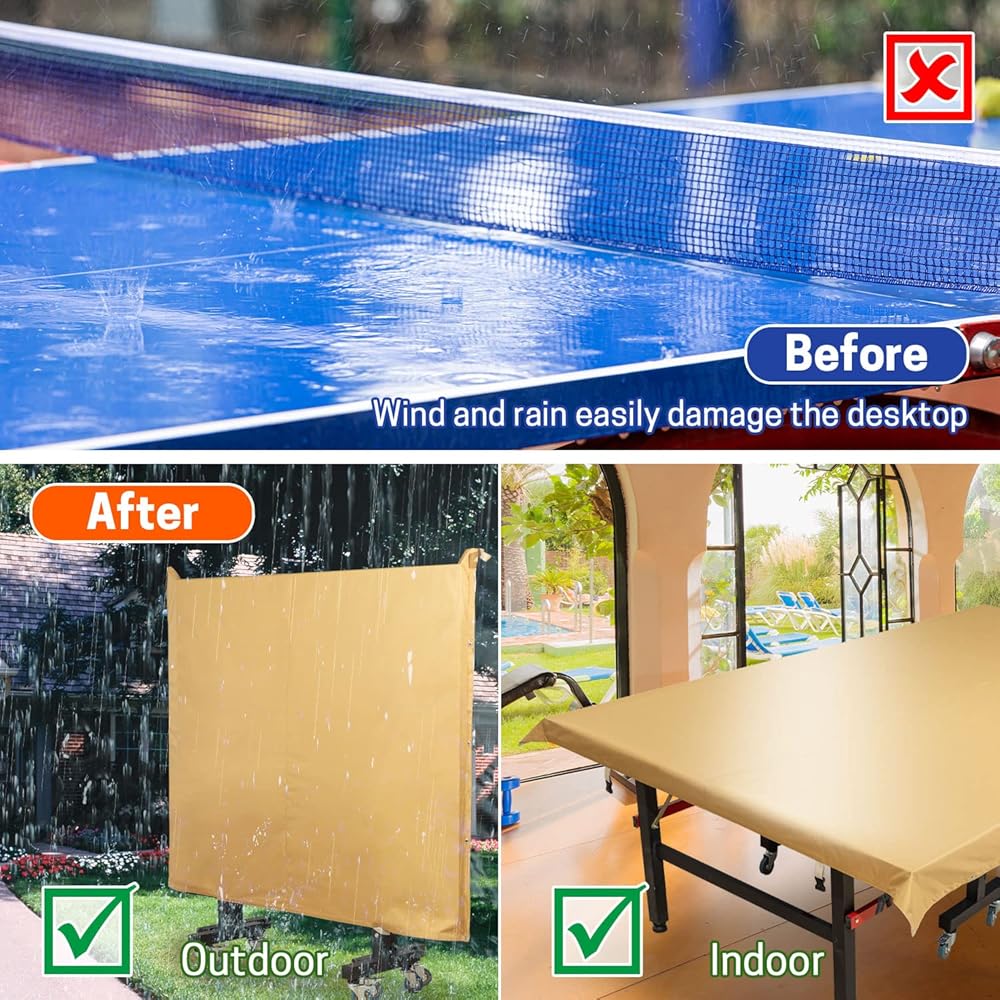 【مقاوم للماء والأشعة فوق البنفسجية】غطاء تنس الطاولة مصنوع من ثلاث طبقات من المواد: طلاء للأشعة فوق البنفسجية، نسيج بوليستر 600D وطلاء فضي، والذي يمكن أن يعكس 95% من الأشعة فوق البنفسجية وألوان ثابتة للاستخدام طويل الأمد. تمت معالجة غطاء طاولة بينج بونج بمادة طاردة للماء بحيث تنزلق قطرة الماء بسهولة من القماش.
