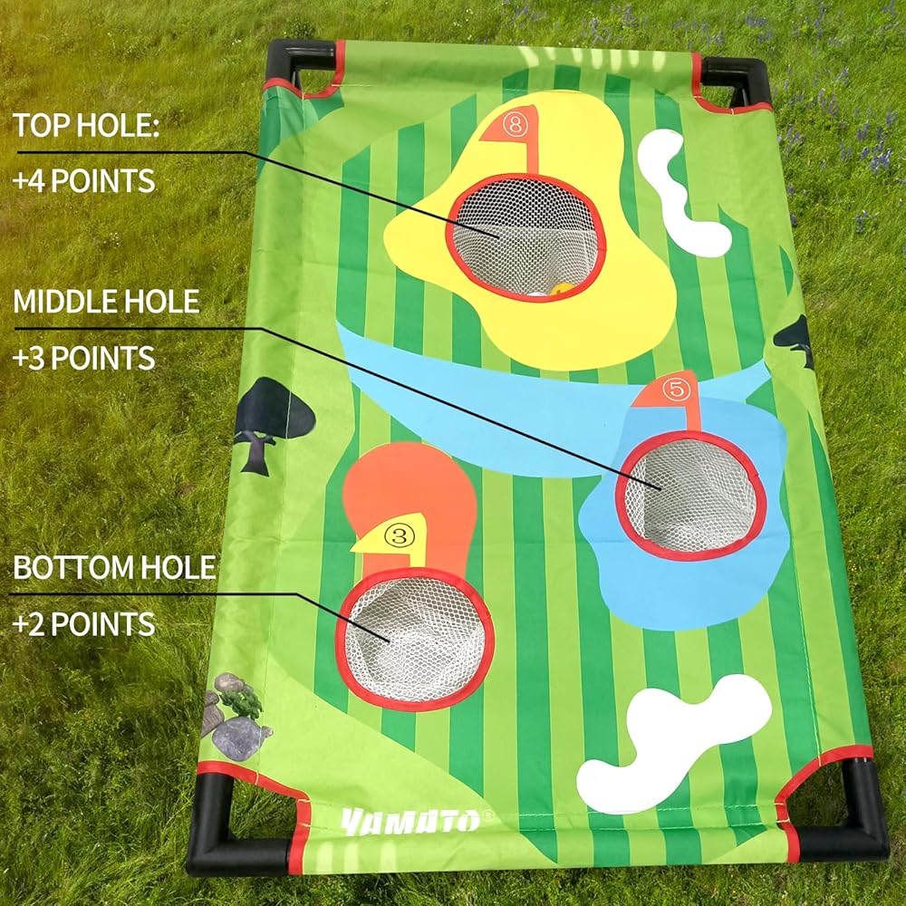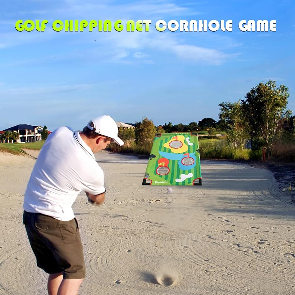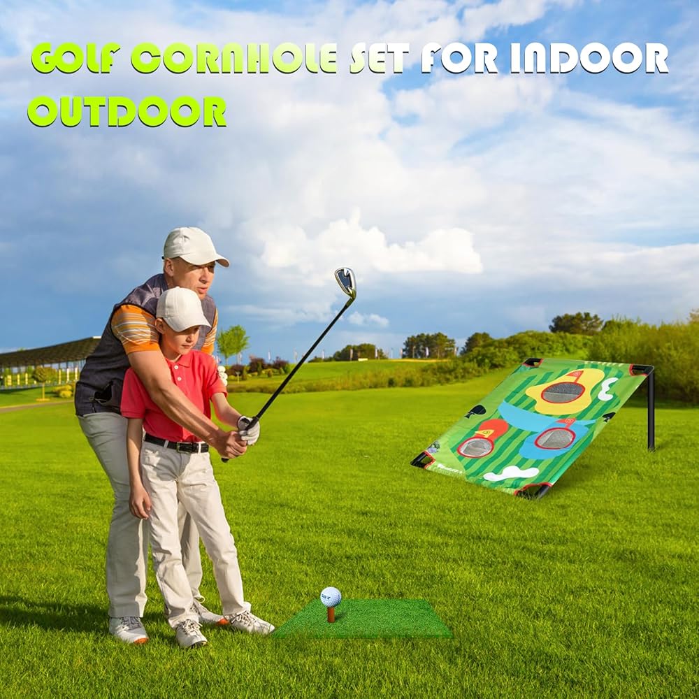 GOLF CORNHOLE GAME - With the cornhole golf game you can keep score, practice chipping, or simply have fun challenging friends and playing golf games in a cornhole style but with the skills, only a golfer brings to the game. Great for indoor golf or golf practice.