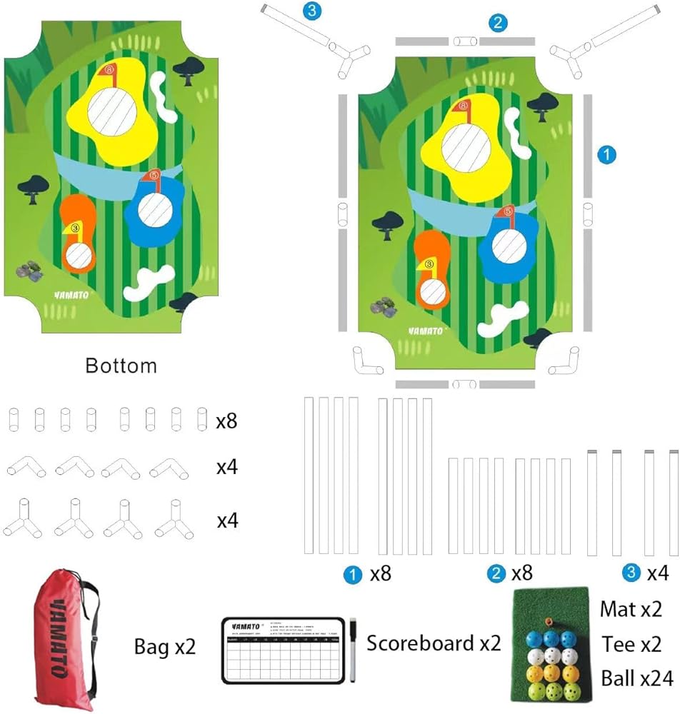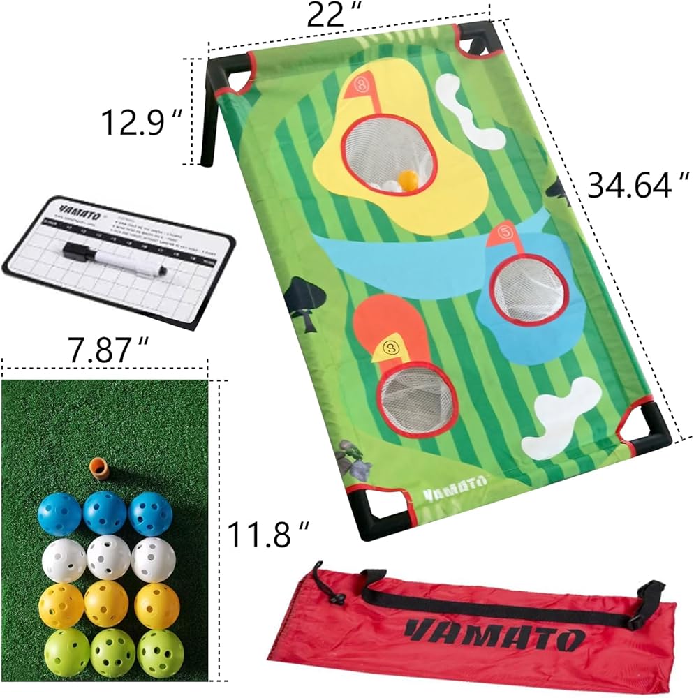 ESSENTIAL GOLF ACCESSORIES - This chipping practice set comes with everything you need to play. Comes with 2 Target Boards, 2 Hitting Mats, 1 Erasable Scorecard, 1 Carrying Bag, and includes 12 soft foam golf balls in different colors to allow up to four players to participate and make it safer to play without breaking those outside windows.