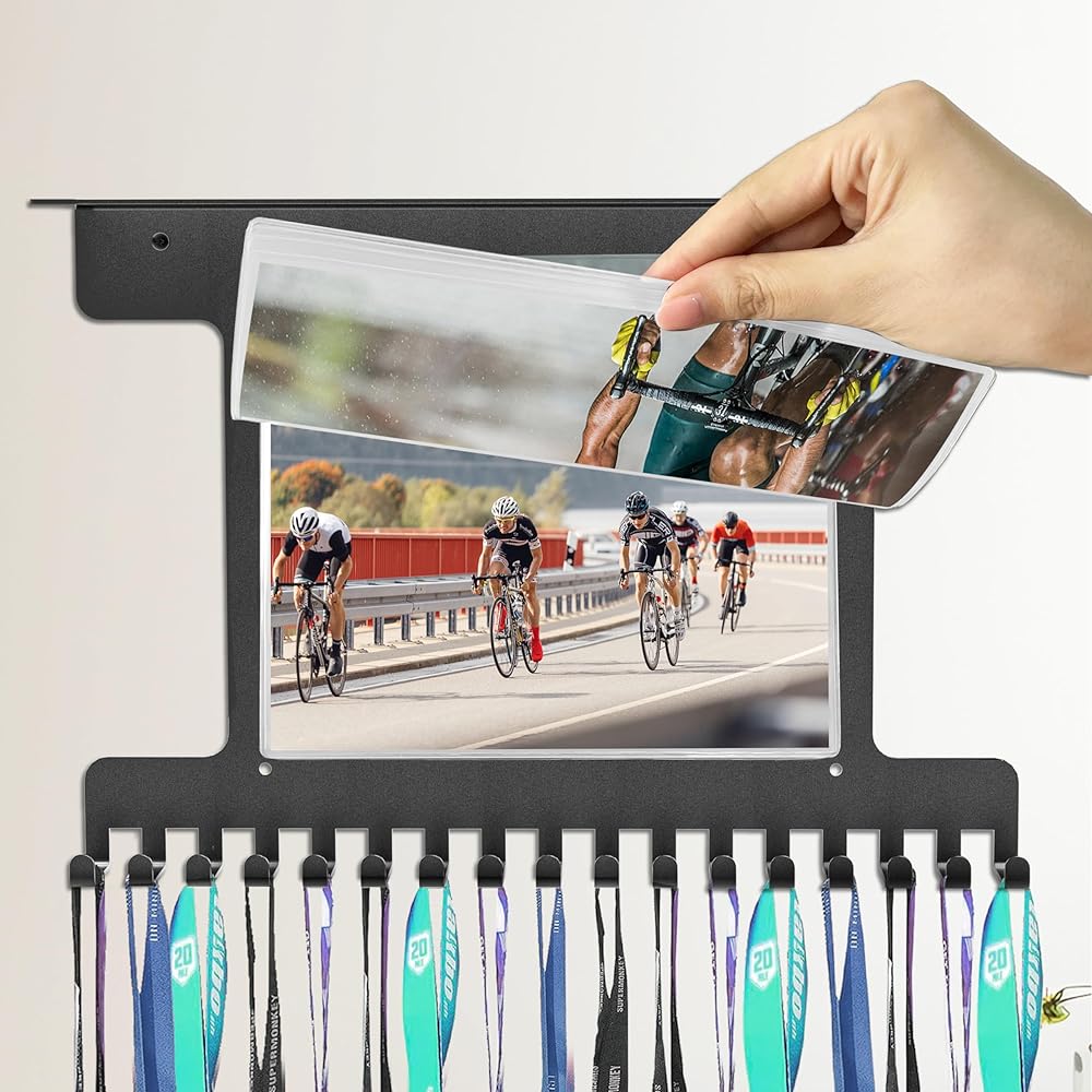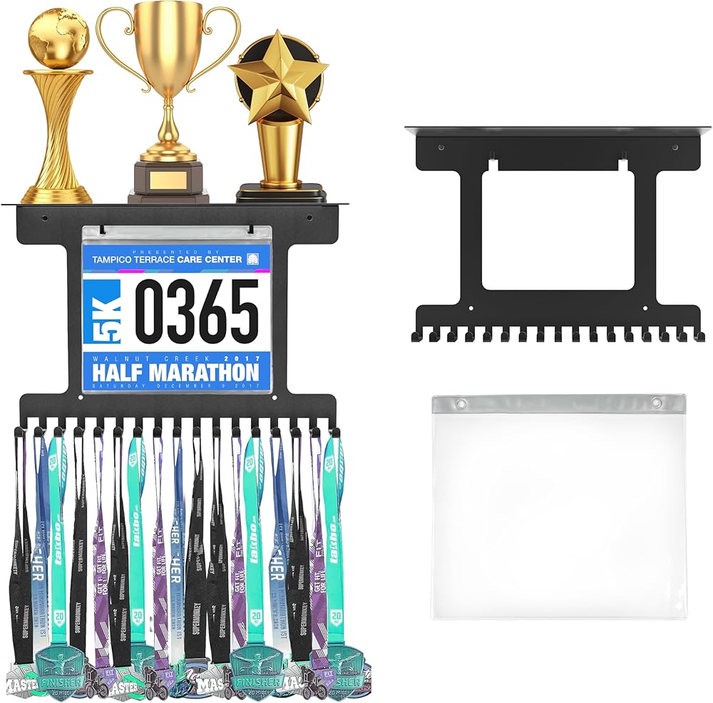 🏆【سعة تخزين كبيرة】: تحتوي مريلة السباق ورف عرض الميداليات على 10 ألواح بلاستيكية من الفينيل لتخزين مرايل السباق والصور و16 خطافًا حديديًا يمكنها تعليق 40 إلى 60 ميدالية. مادة رف عرض الميداليات هذه مصنوعة من الحديد، وهي متينة جدًا، ولن تنحني حتى إذا قمت بتعليق العديد من الميداليات عليها.