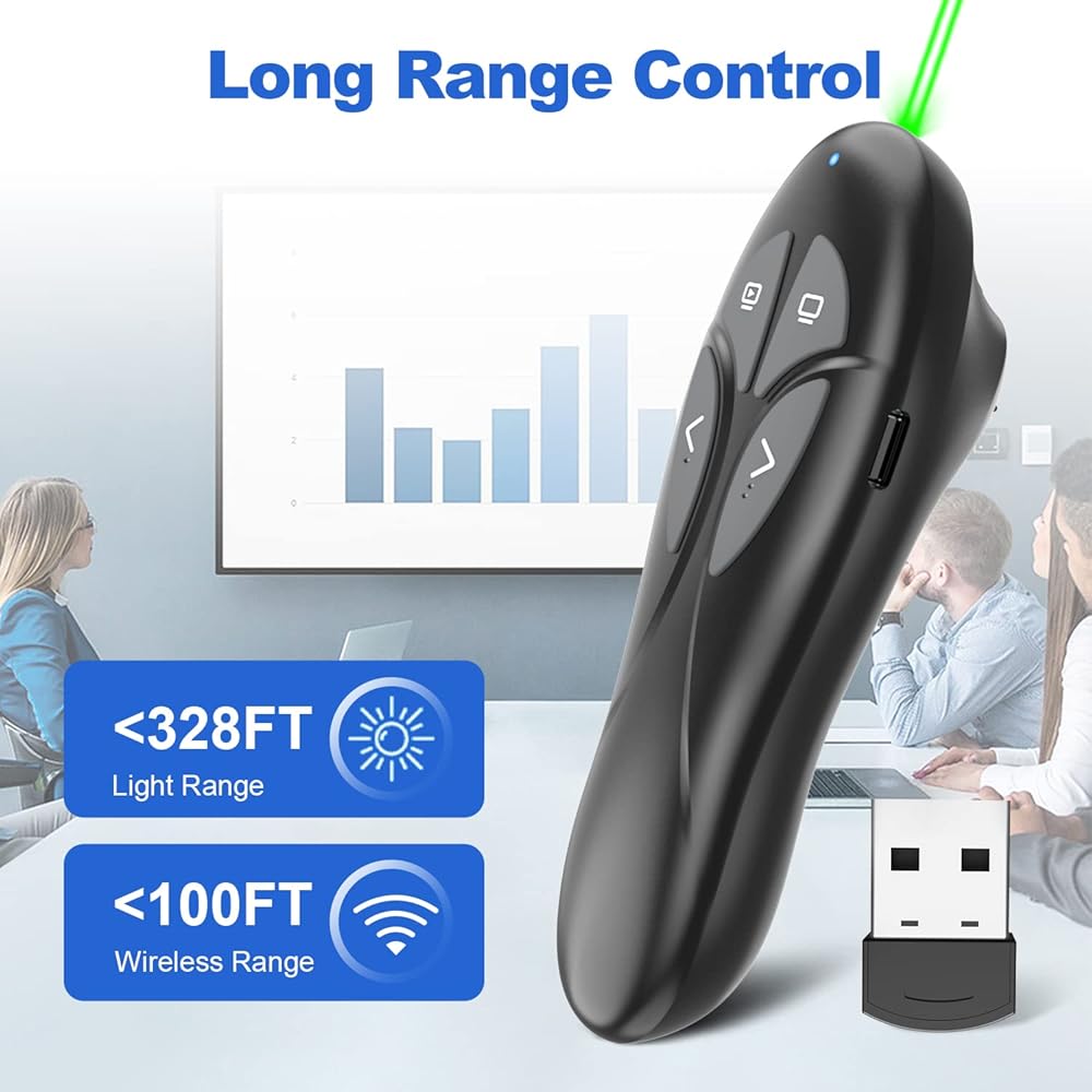 [مؤشر ليزر أحمر ساطع] يمكن لمؤشر الليزر الأحمر للعروض التقديمية أن يستهدف أو يبرز أو يلفت الانتباه إلى أجزاء معينة من الشرائح والرسوم البيانية والصور وما إلى ذلك. نطاق مؤشر الليزر الأحمر اللاسلكي باور بوينت: 328FT/100M.