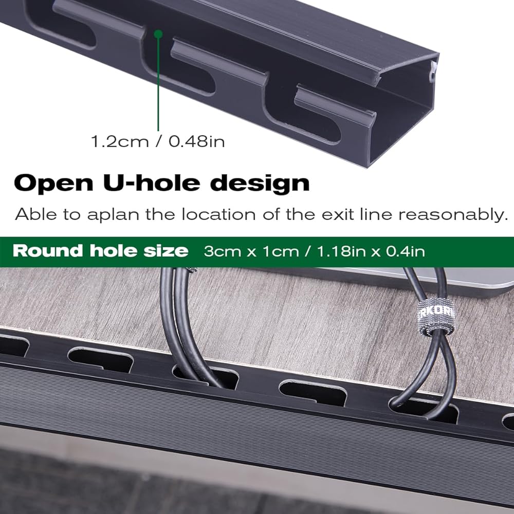 إدارة فعالة للكابلات أسفل المكتب - تم تصميم جانب فتحة الكابل بفتحة دائرية على شكل حرف U، والتي يمكنها تخطيط منفذ الكابل بشكل معقول وتثبيت موضع الكابل، مما يجعل الكابل أكثر أناقة وتنظيمًا. الفتحة المستديرة على شكل حرف U متوافقة مع مرور الأسلاك التي يقل قطرها عن 10 ملم. أخدود الكابل هذا مناسب تمامًا لإدارة الأسلاك أسفل الطاولة. إخفاء كابلات HDMI وخطوط الهاتف وكابلات تمديد الطاقة وكابل الفاكس وكابل الشبكة وما إلى ذلك.
