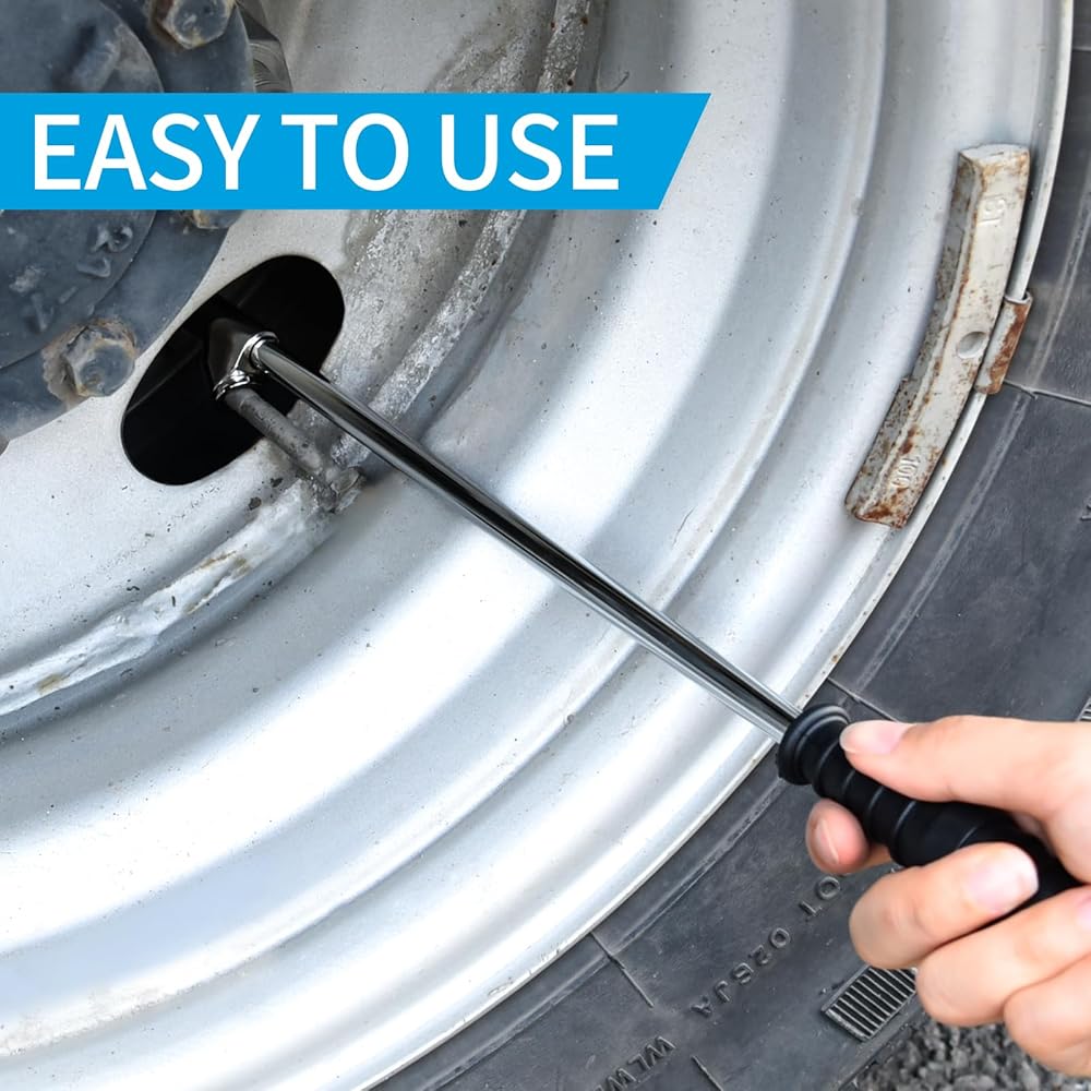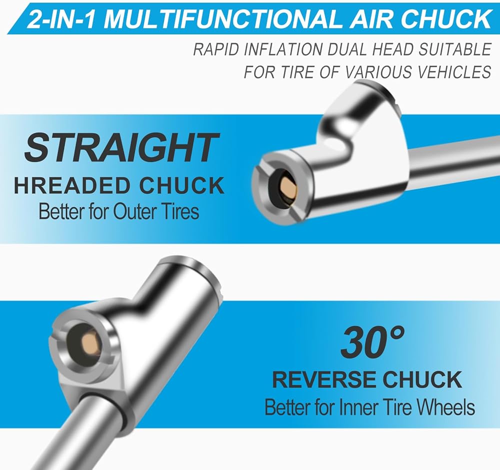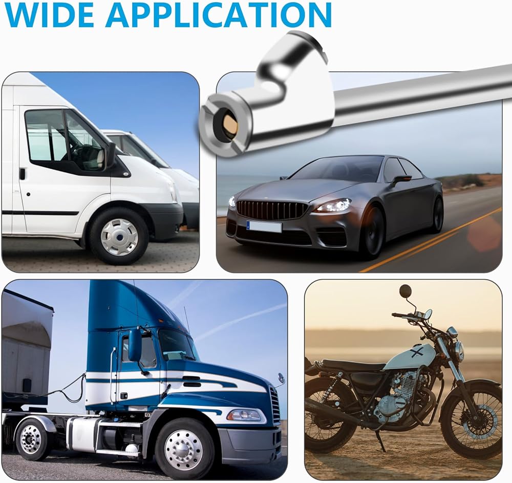 • خراطيش هواء عالية الجودة --- رؤوس مستقيمة مصممة خصيصًا للعجلات الخارجية، وخراطيش عكسية بزاوية 30 درجة للعجلة الداخلية/المفردة أو الصمامات التي يصعب الوصول إليها. تصميم 2 في 1 متعدد الوظائف مناسب للشاحنات والدراجات النارية وبيوت السيارات والحافلات وما إلى ذلك.