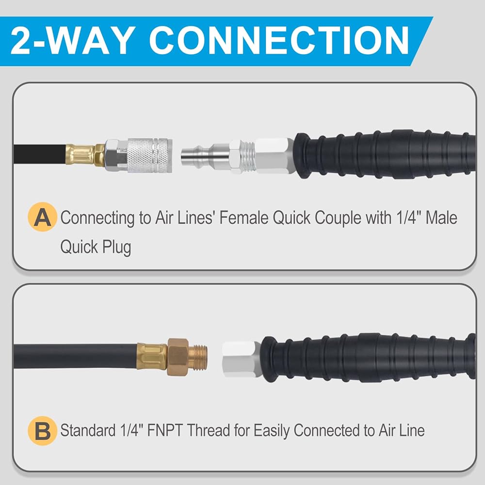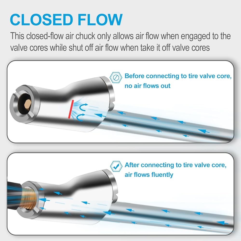 • اتصال ثنائي الاتجاه --- يتميز كل من ظرف الهواء بخيط NPT أنثى مقاس 1/4 بوصة للتوصيل بسهولة بخطوط الهواء أو ضاغط الهواء أو مقاييس نفخ الإطارات لتضخم الإطارات. يحافظ ظرف الهواء ذو ​​الرأس المزدوج هذا على عدم تسرب عبوات الإطارات.