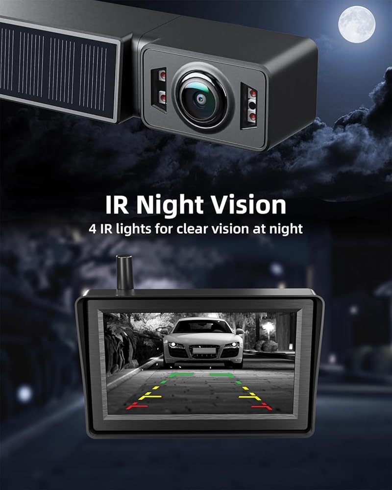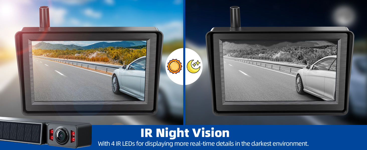 【 تعزيز الرؤية الليلية بالأشعة تحت الحمراء 】الكاميرا الاحتياطية الشمسية اللاسلكية مع 4 مصابيح LED تعمل بالأشعة تحت الحمراء لتوفير رؤية ليلية جيدة على بعد 30 قدمًا في أحلك الليل، لا حاجة إلى أي إضاءة محيطة. خاصة في البيئات منخفضة الإضاءة أو المظلمة، فإن عرض المزيد من التفاصيل في الوقت الفعلي يضمن سلامتك أثناء الرجوع للخلف.