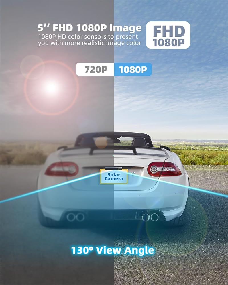 【 كاميرا احتياطية عالية الدقة 1080 بكسل مع شاشة واضحة مقاس 5 بوصات 】تم تجهيز الكاميرا الاحتياطية اللاسلكية بالطاقة الشمسية بمستشعرات ألوان عالية الدقة 1080 بكسل لتقدم لك ألوان صور أكثر واقعية. مع شاشة HD 1080 بكسل 5 بوصات، توفر صورة حية لتجنب اختلافات الألوان أثناء النهار والليل. ليلة.