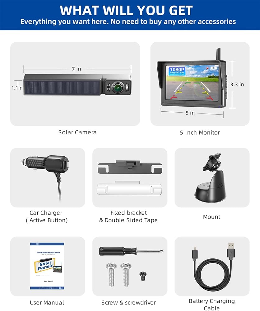 كاميرا احتياطية لاسلكية تعمل بالطاقة الشمسية مع رؤية ليلية بالأشعة تحت الحمراء، تثبيت لمدة 3 دقائق بدون أسلاك، مجهزة بشاشة 5 بوصة عالية الدقة 1080 بيكسل، كاميرا عكسية مقاومة للماء IP69K للسيارات والشاحنات والمقطورات RV
