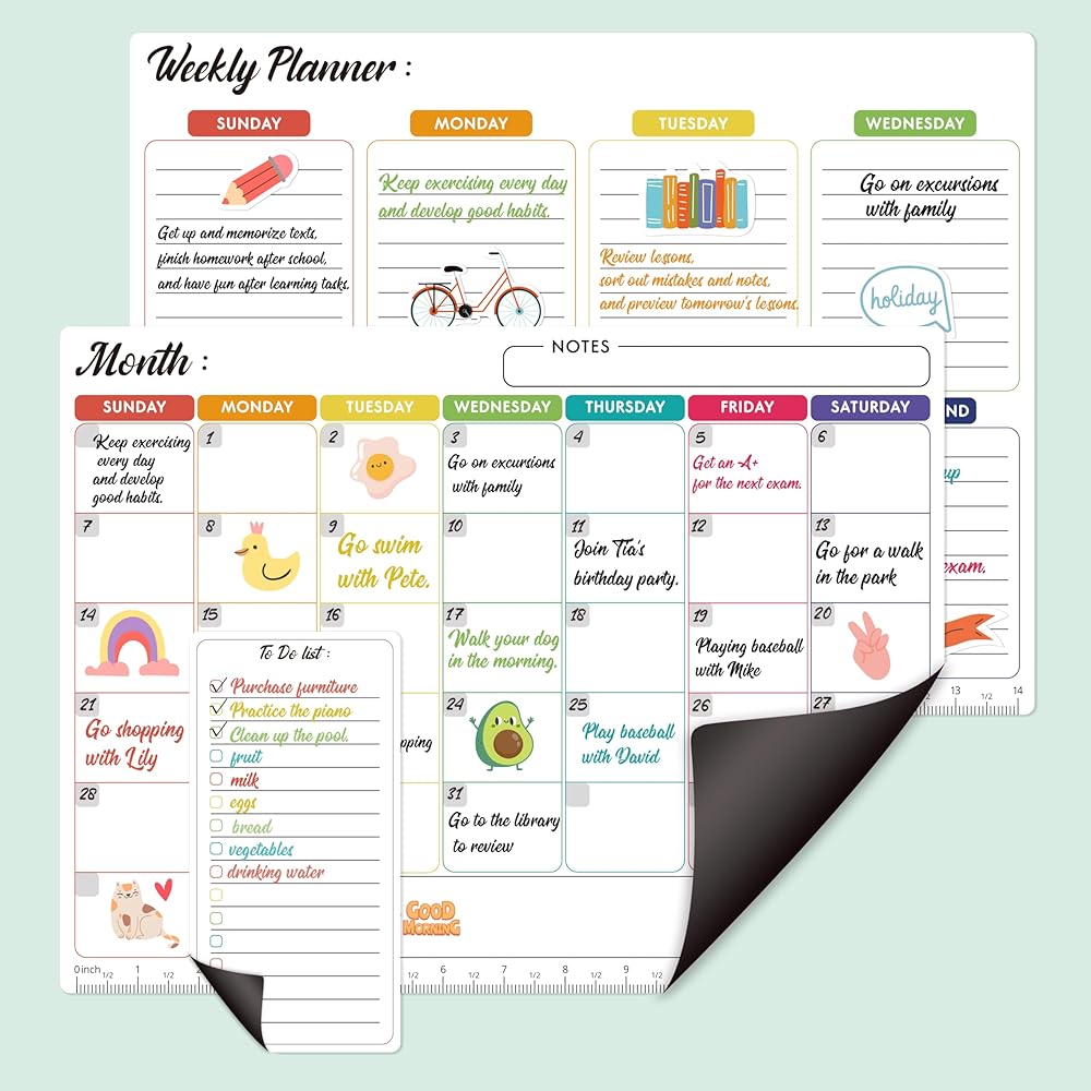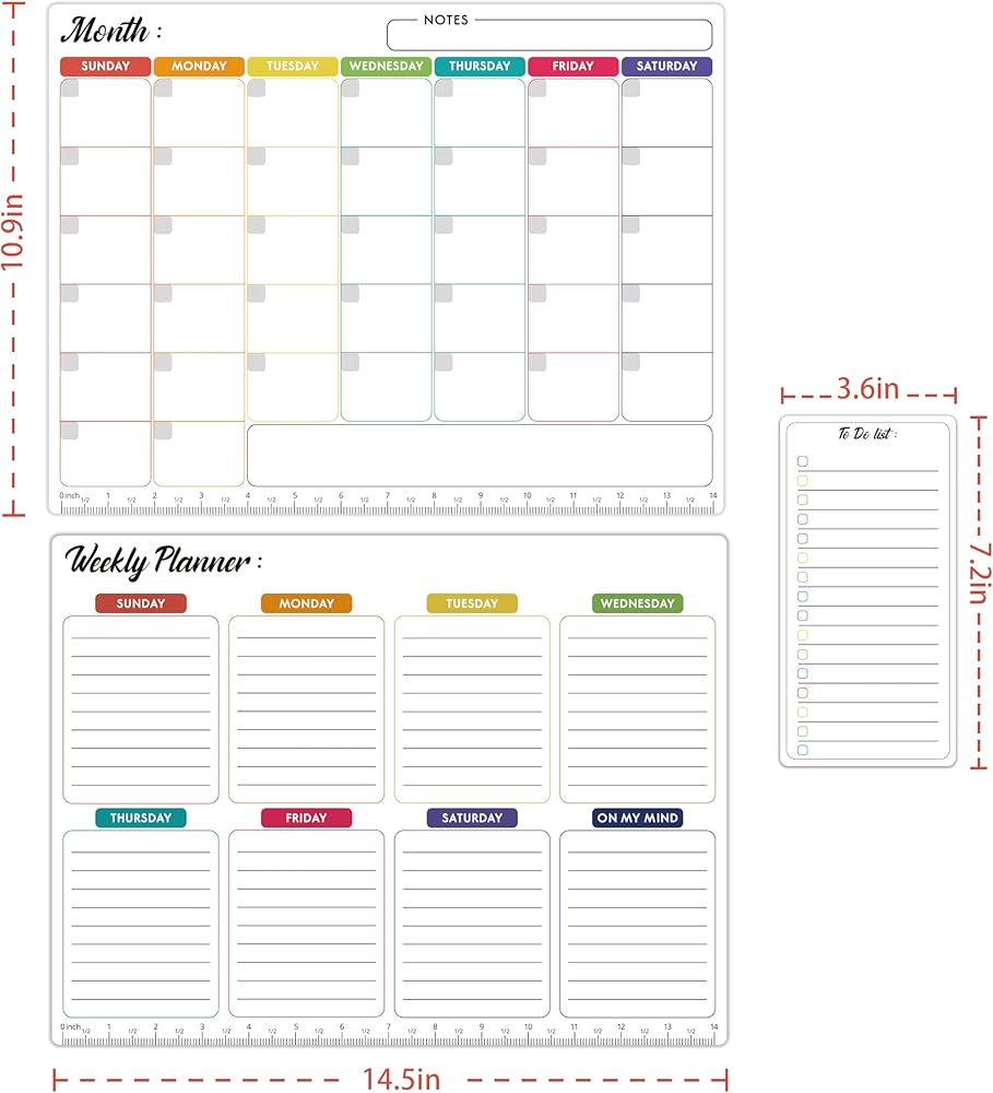 🥑 نظرة عامة على تقويم المسح الجاف: لوحة تقويم للمسح الجاف مقاس 14.4 بوصة × 10.9 بوصة للجدار، ولوحة مغناطيسية لقائمة البقالة مقاس 7.3 بوصة × 3.7 بوصة، وزاوية قطع الحواف. لن ترغب في تفويت ثلاجة التقويم هذه للحفاظ على موعدك منظمًا وتحرير عقلك من جدول الأعمال المزدحم والتوافه.