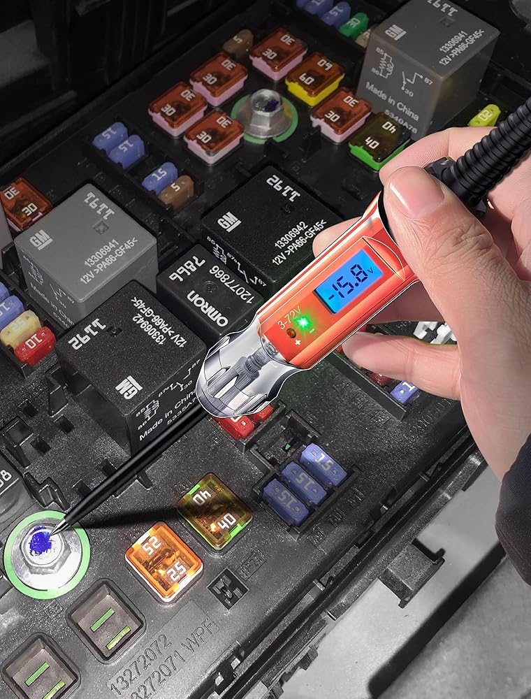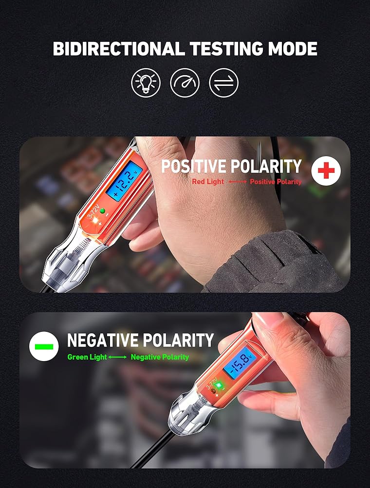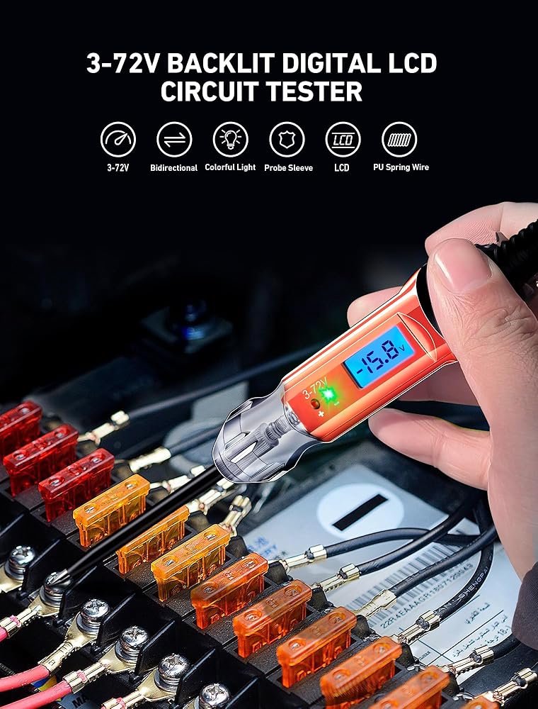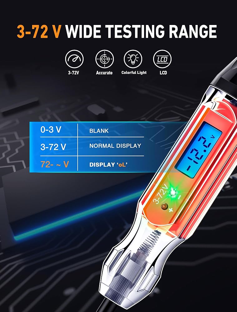 مصباح اختبار السيارات شديد التحمل 3-72 فولت من EVOULTES، جهاز اختبار دائرة LCD رقمي بإضاءة خلفية مع الفولتميتر وقطبية اللون المزدوج يشير إلى الضوء، قلم اختبار الضوء الكهربائي ثنائي الاتجاه DC