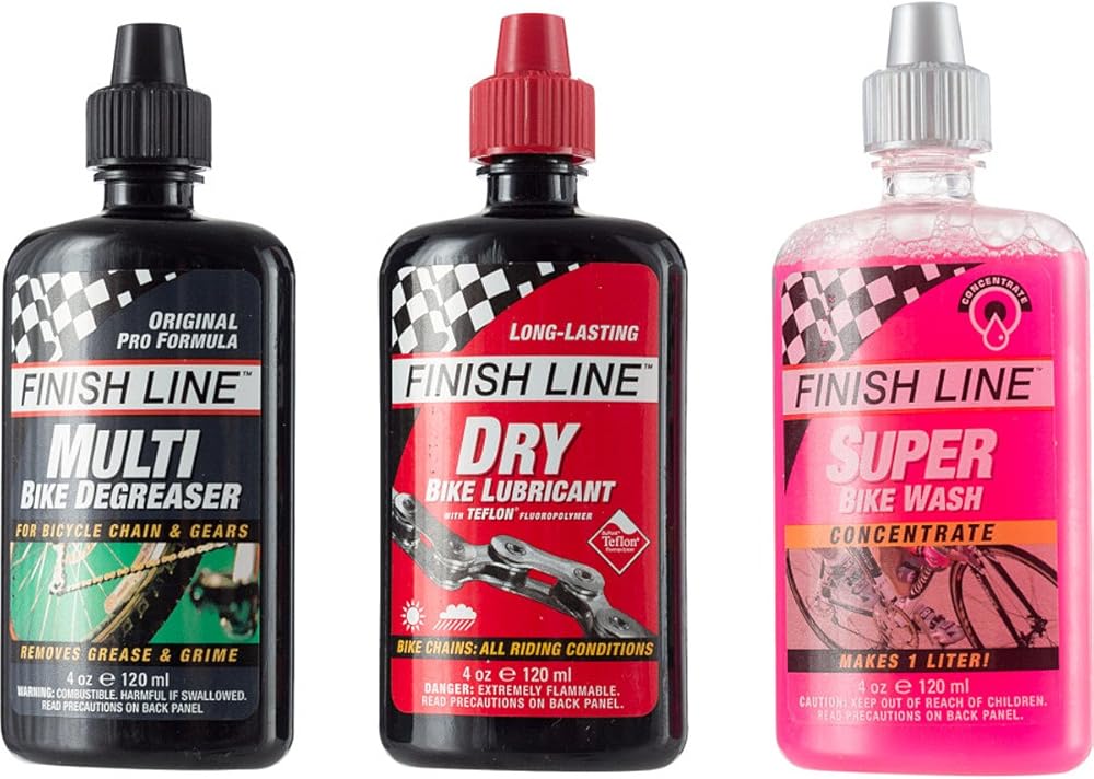The essential products you need to keep your bike clean, smooth and looking snazzy, Multi-Degreaser to clean (it's strong, but still safe with all surfaces), DRY Lube (won't attract dirt, lasts a long time) and Super Bike Wash (4oz of concentrate make 32oz of wash) to keep your bike clean and looking like new. All in a great value pack.