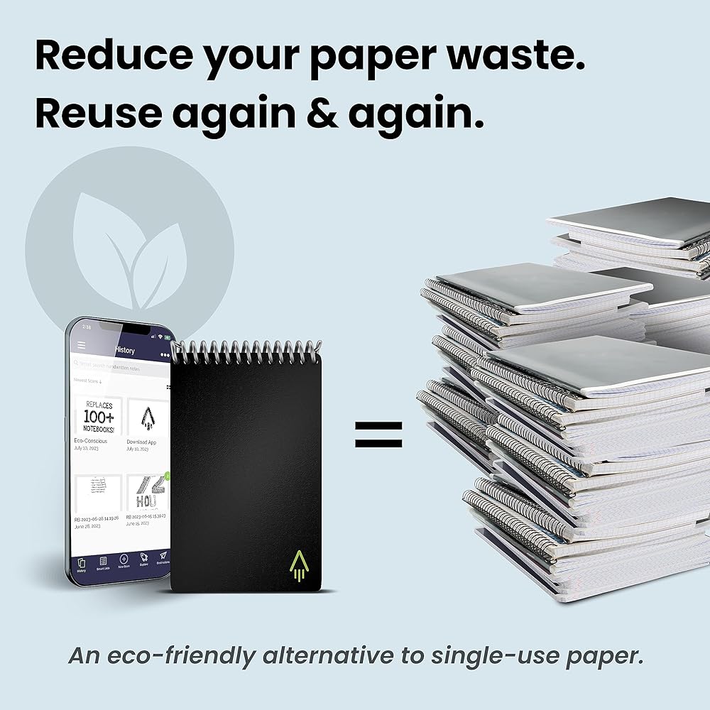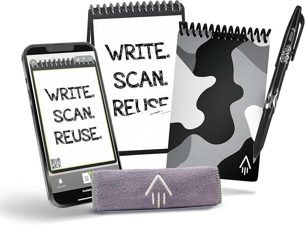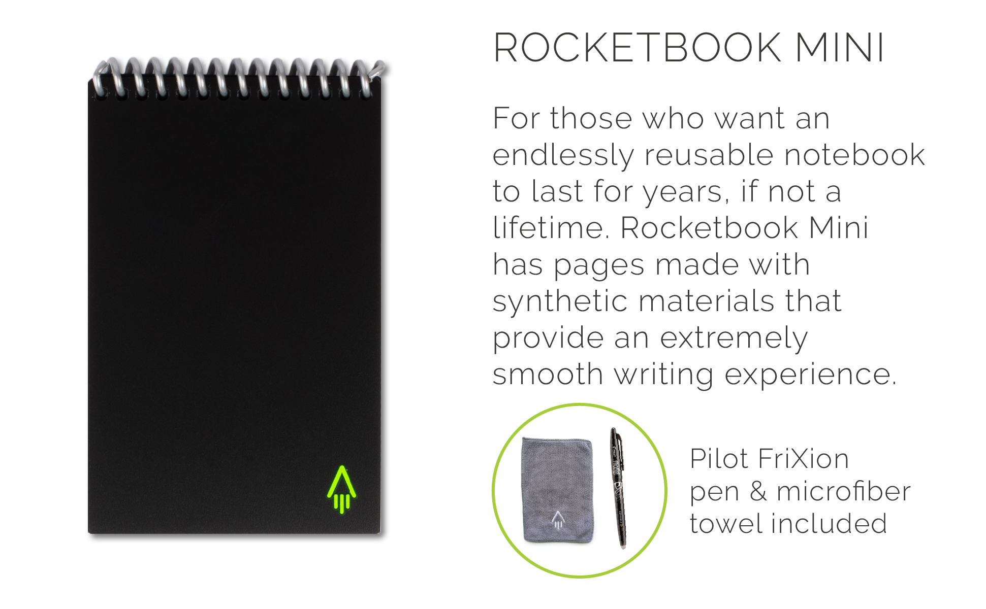 Includes 1 Rocketbook Mini Size (3.5" x 5.5") Notebook, 1 Pilot Frixion Pen, and 1 Microfiber Cloth